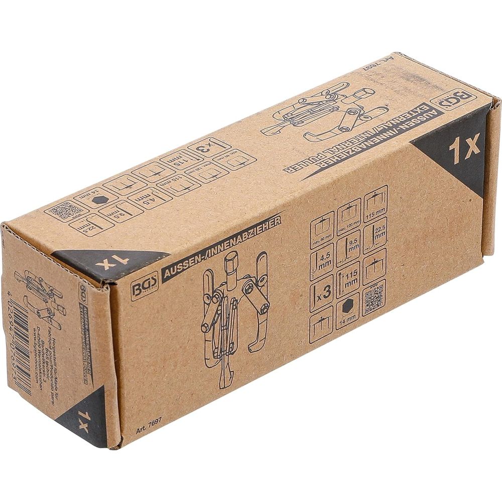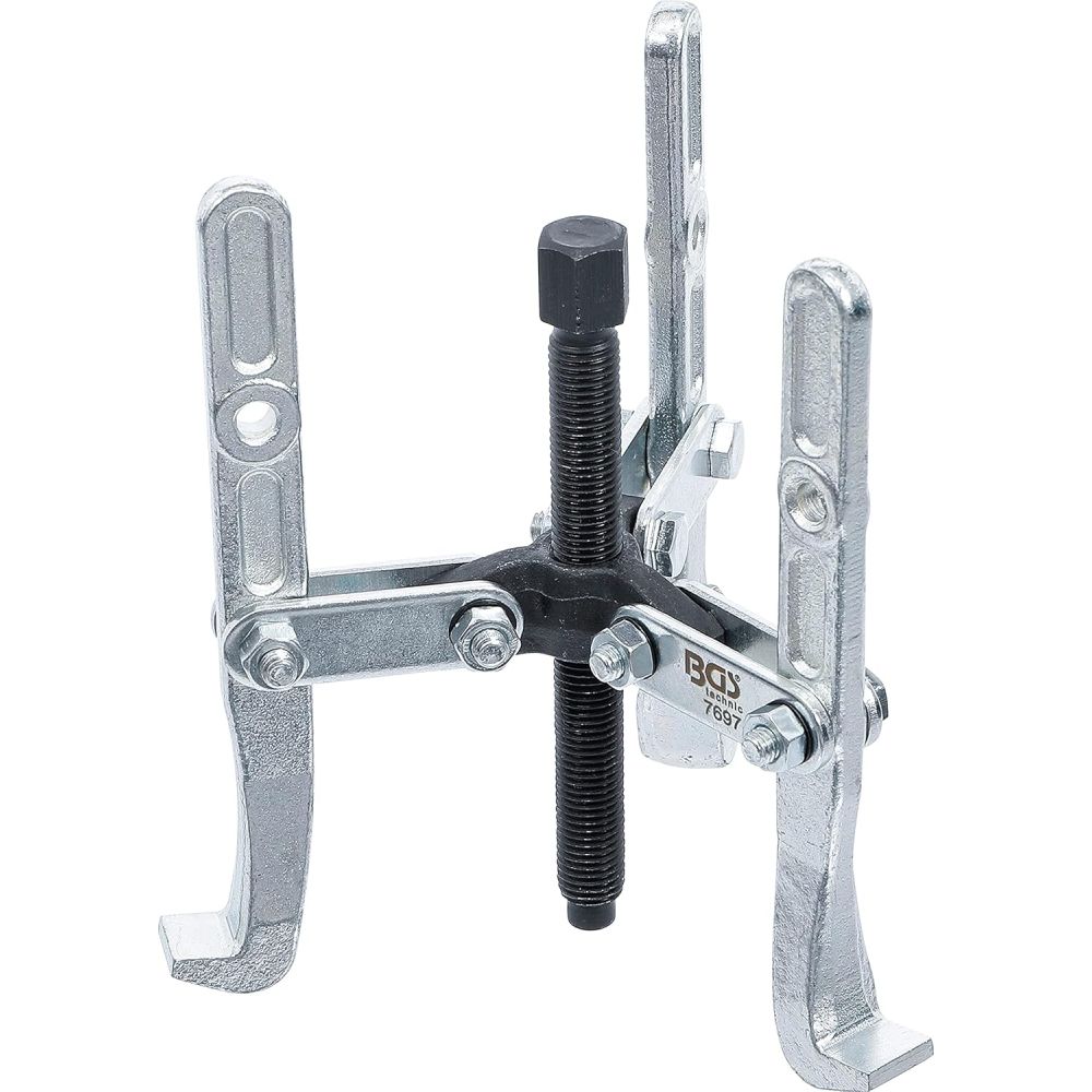 3-armet aftrækkersæt 4"/100 mm fra BGS. Armene er svingbare og kan bruges både ind- og udvendig. Beregnet for brug på bremsetromler, remskiver, tandhjul etc.