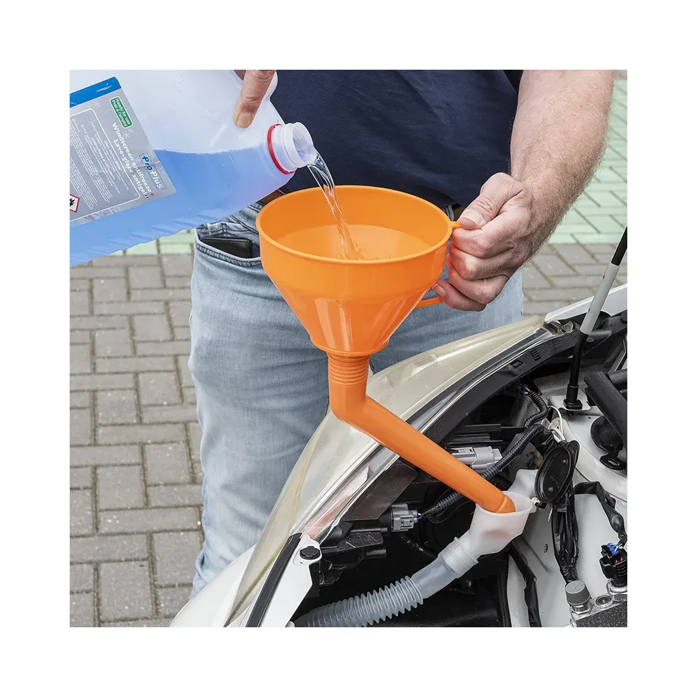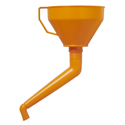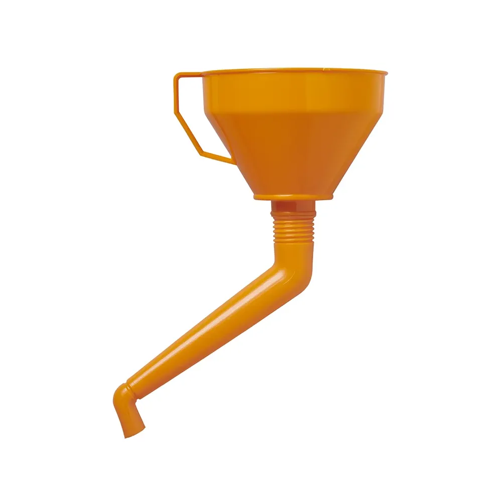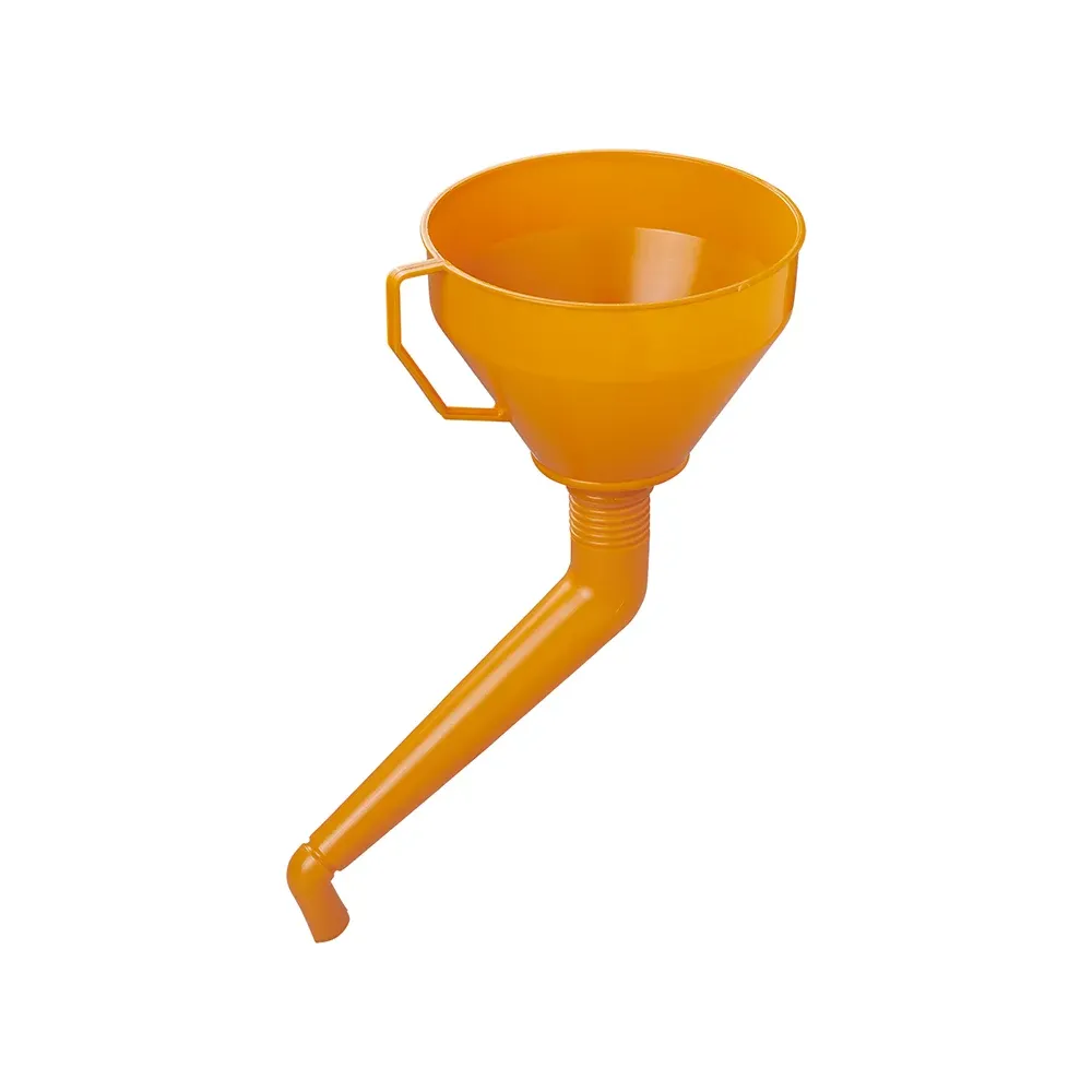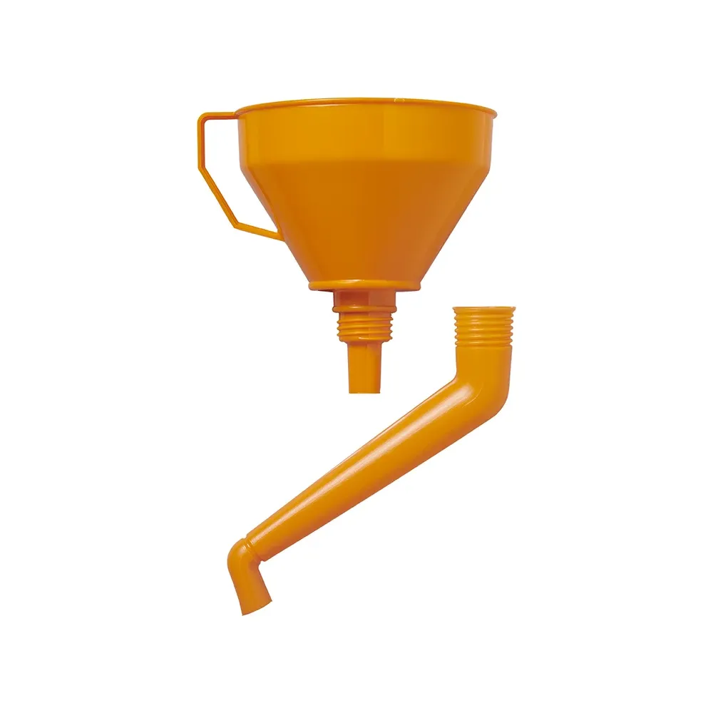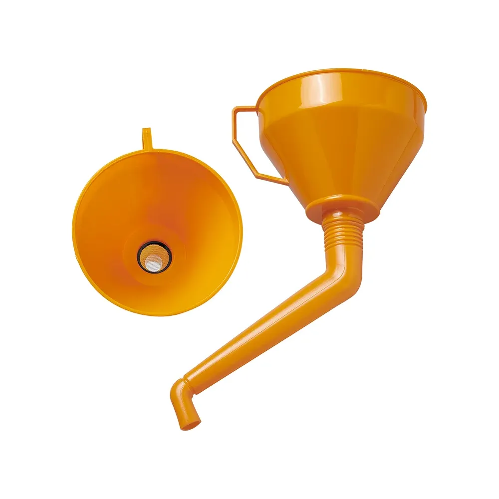 Praktisk og robust tragt, der gør det nemt at påfylde væsker i tanke og beholdere – selv på svært tilgængelige steder. Den dobbeltvinklede tud giver optimal rækkevidde og kontrol ved påfyldning, hvilket gør den ideel til brug på biler, maskiner, havemaskiner og andre motordrevne enheder. Tragten er udstyret med et integreret finmasket filter, som effektivt opfanger snavs og urenheder, så du undgår forurening af tanken. Det solide håndtag sikrer et godt greb under brug, og den slidstærke plastkonstruktion gør tragten let at rengøre og genanvende. En funktionel løsning til både værksted, garage og professionelt brug.