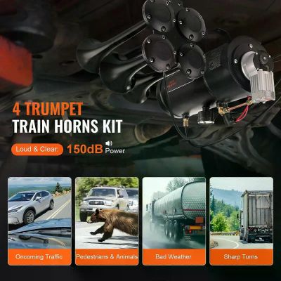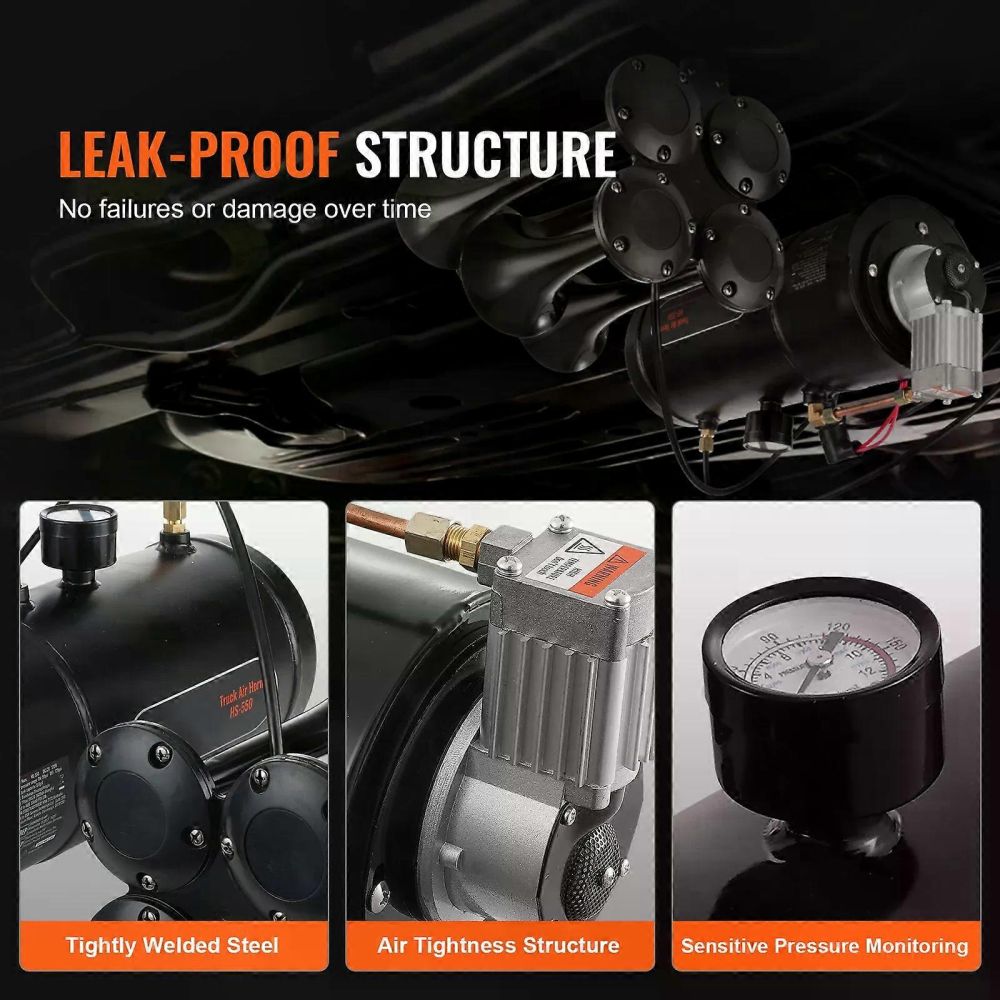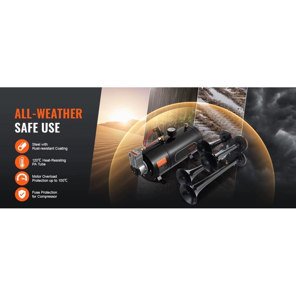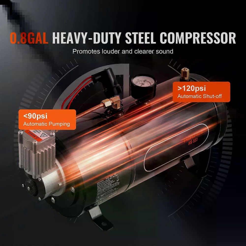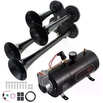 Kompressorhorn med separat kompressor og sorte tragte. Tragte fremstillet i rustfri metal, for at sikre en lang levetid. Kompressorhornet giver en høj og kraftig lyd. Det store brøl tiltrækker fodgængernes opmærksomhed og kan høres overalt. De fire tragte kan producere en lyd på op til 150 dB.