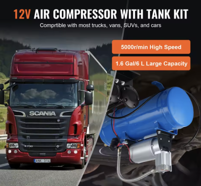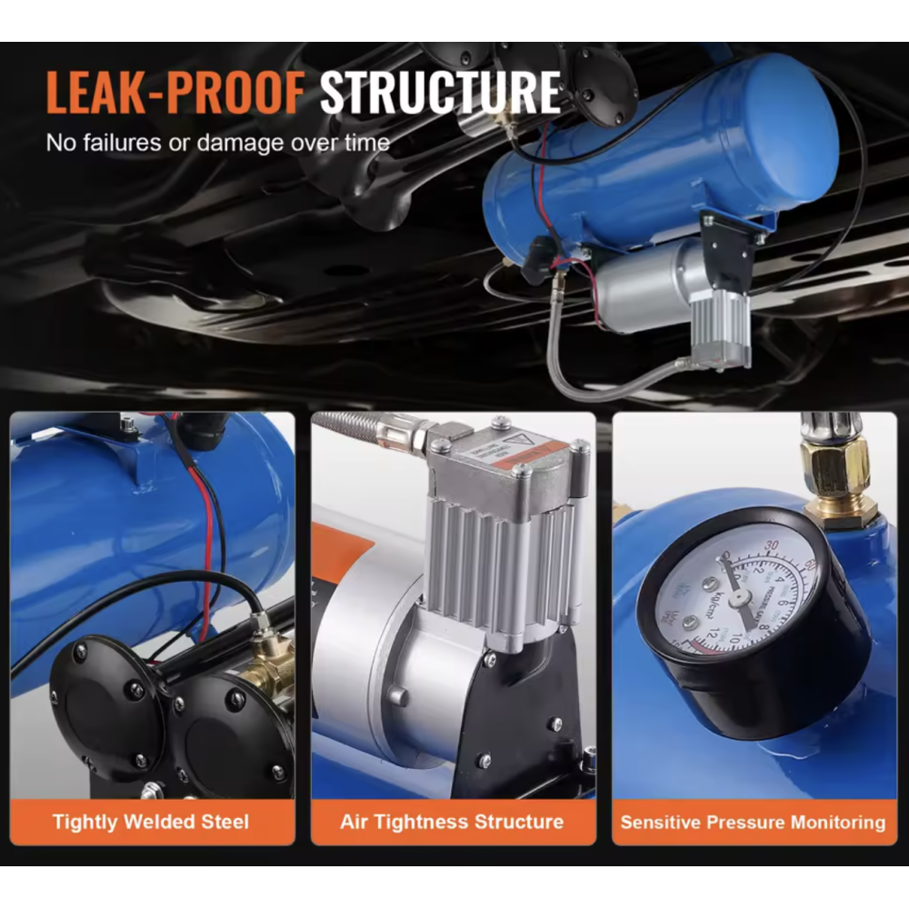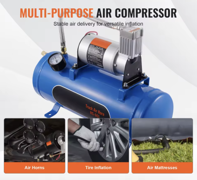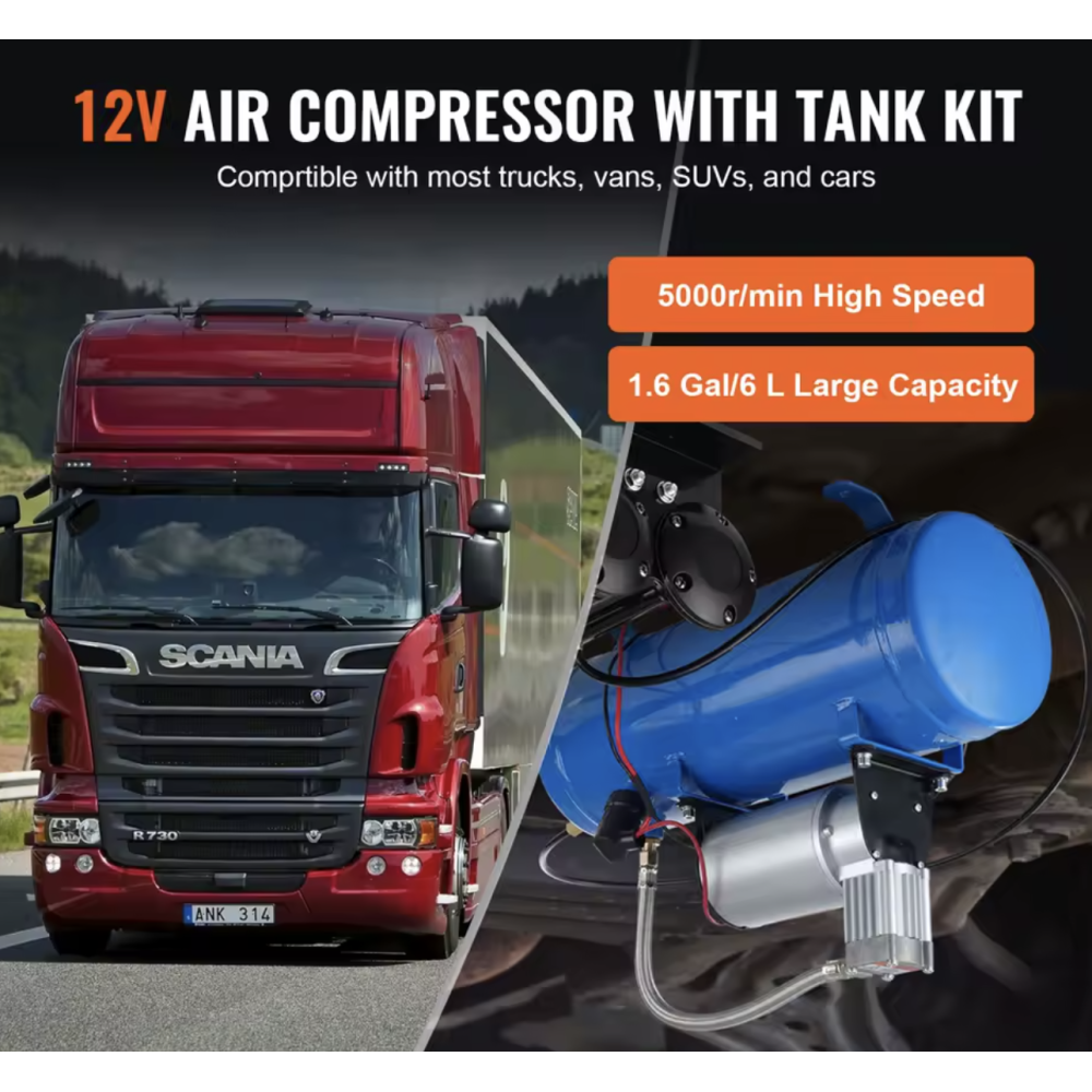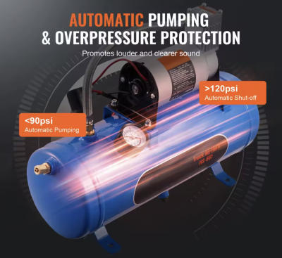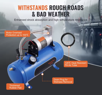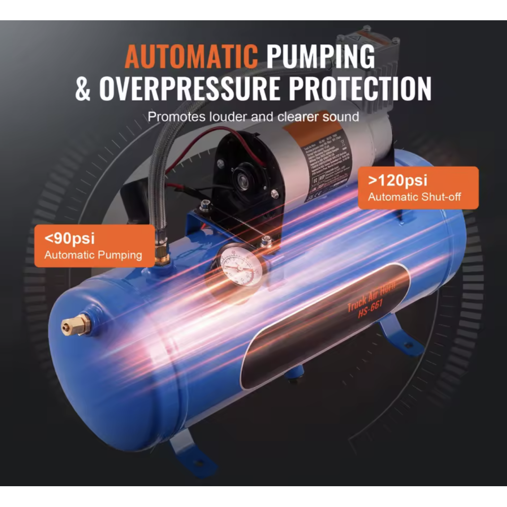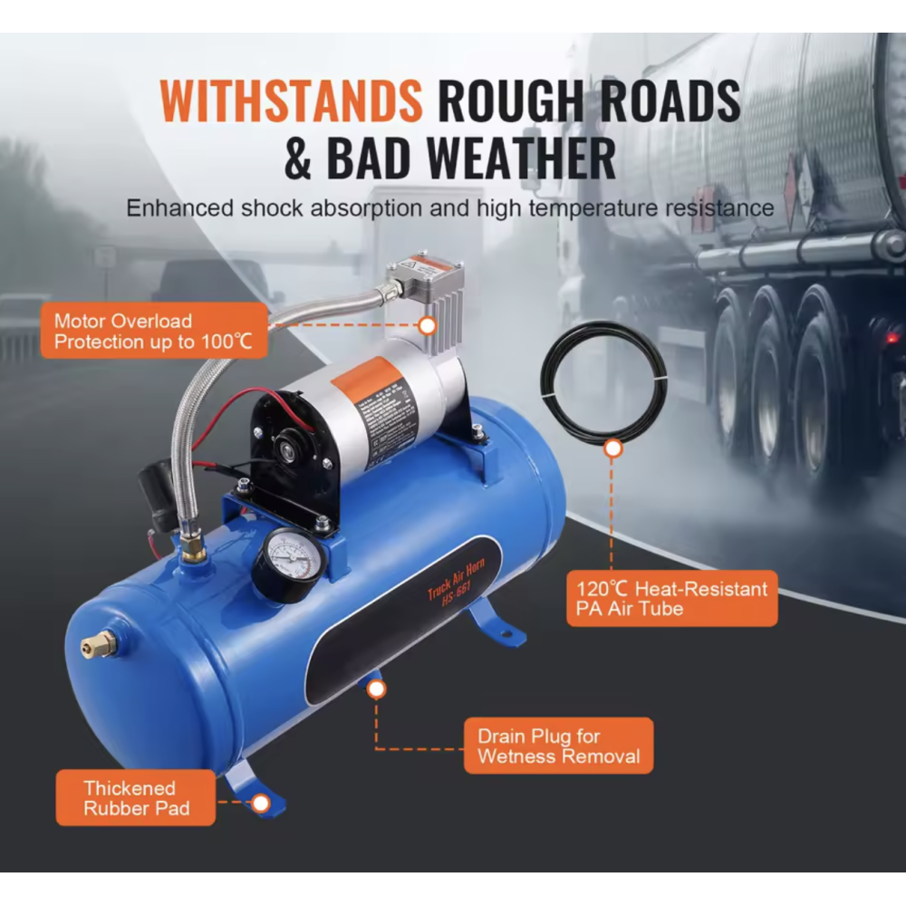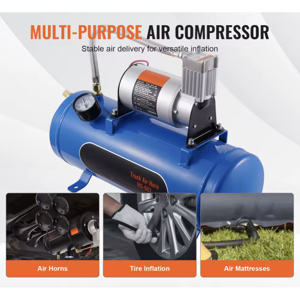 Dette er en stor kompressor, der kan monteres næsten hvor som helst i et køretøj. Denne kompressor leveres med 150 PSI luftkompressor med 6 liter / 1,60 gallon lufttank. Denne kompressor passer til de fleste 12V køretøjer. Denne kompressor er specielt fremstillet til brug i forbindelse med opsætning af horn. Der medfølger 1x kompressor, 1x slange og diverse monteringstilbehør. Leveres uden tragte. SKAL monteres i tørt område.