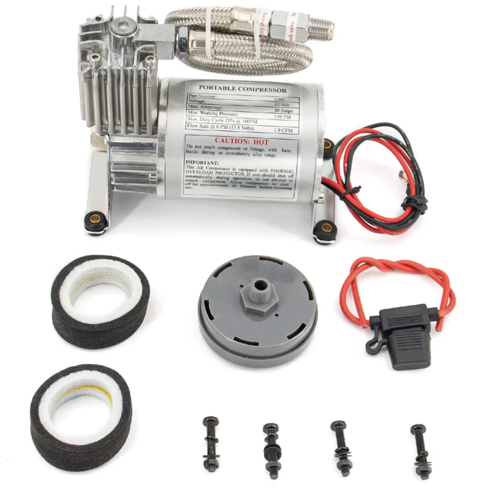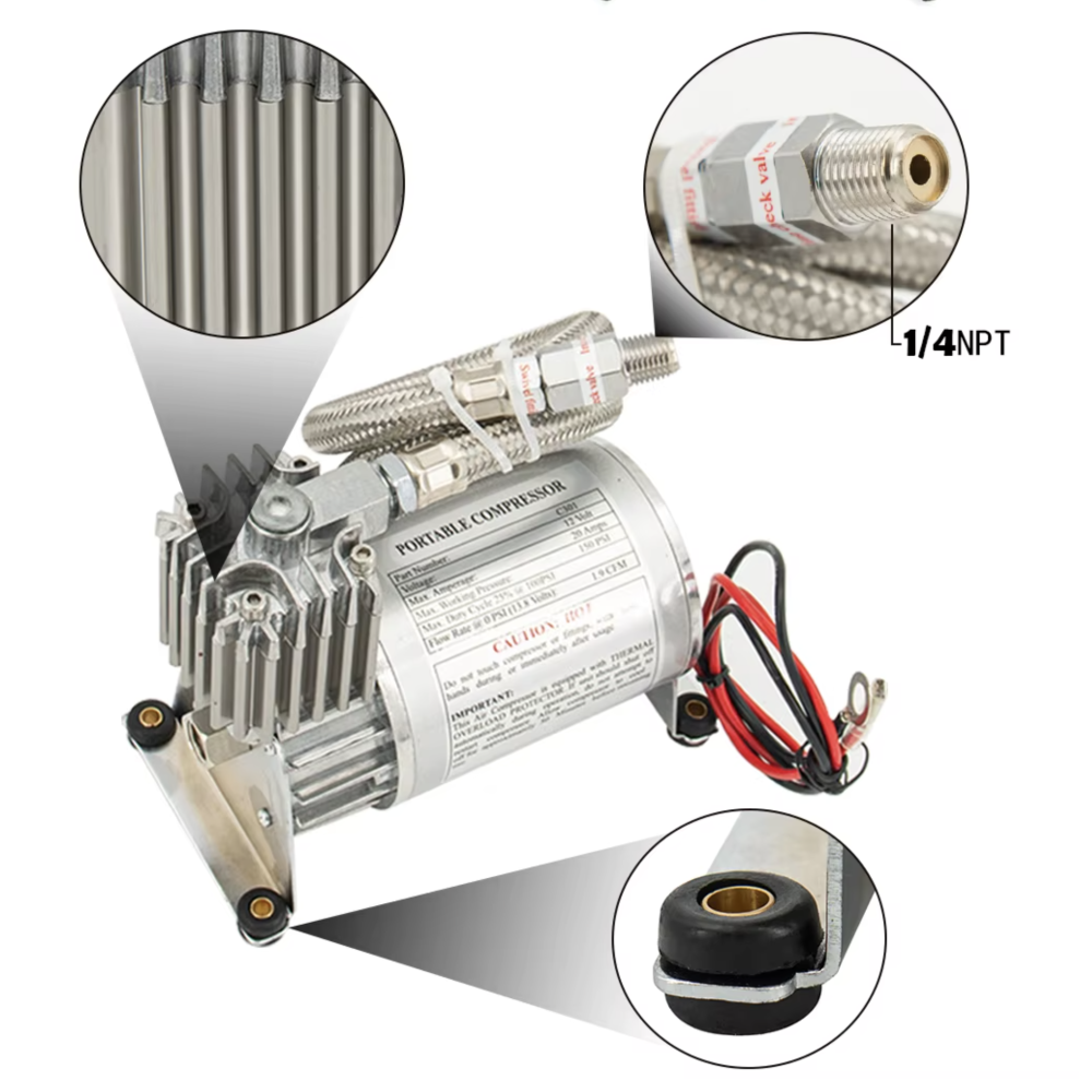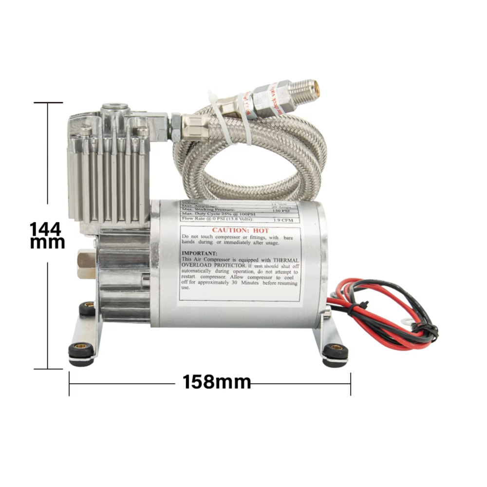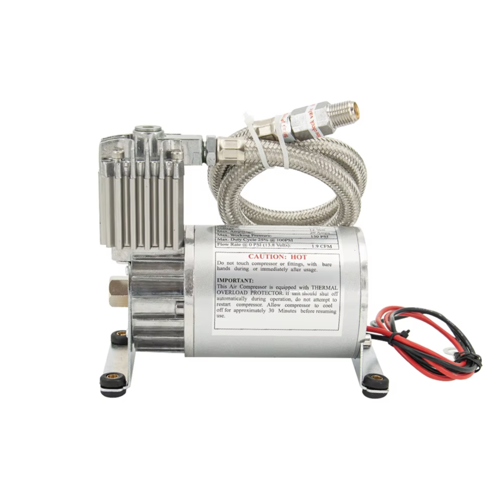 Med en maksimal arbejdstryk på 150 PSI leverer den kraftig og stabil drift. Den er udstyret med horisontale køleribber og et trapezformet topstykke, som hjælper med varmeafledning og forlænger levetiden. Derudover inkluderer den en 1/4” rustfri stålflettet luftslange med indbygget 1/4” NPT kontraventil samt isoleret ledningsføring for sikker og driftssikker installation. Motoren kører på 12V og er baseret på en permanent magnetmotor, som giver hurtig respons og høj driftssikkerhed. Produktet er universal, men vi tager forbehold på at produktet ikke passer til alle kompressorhorn.