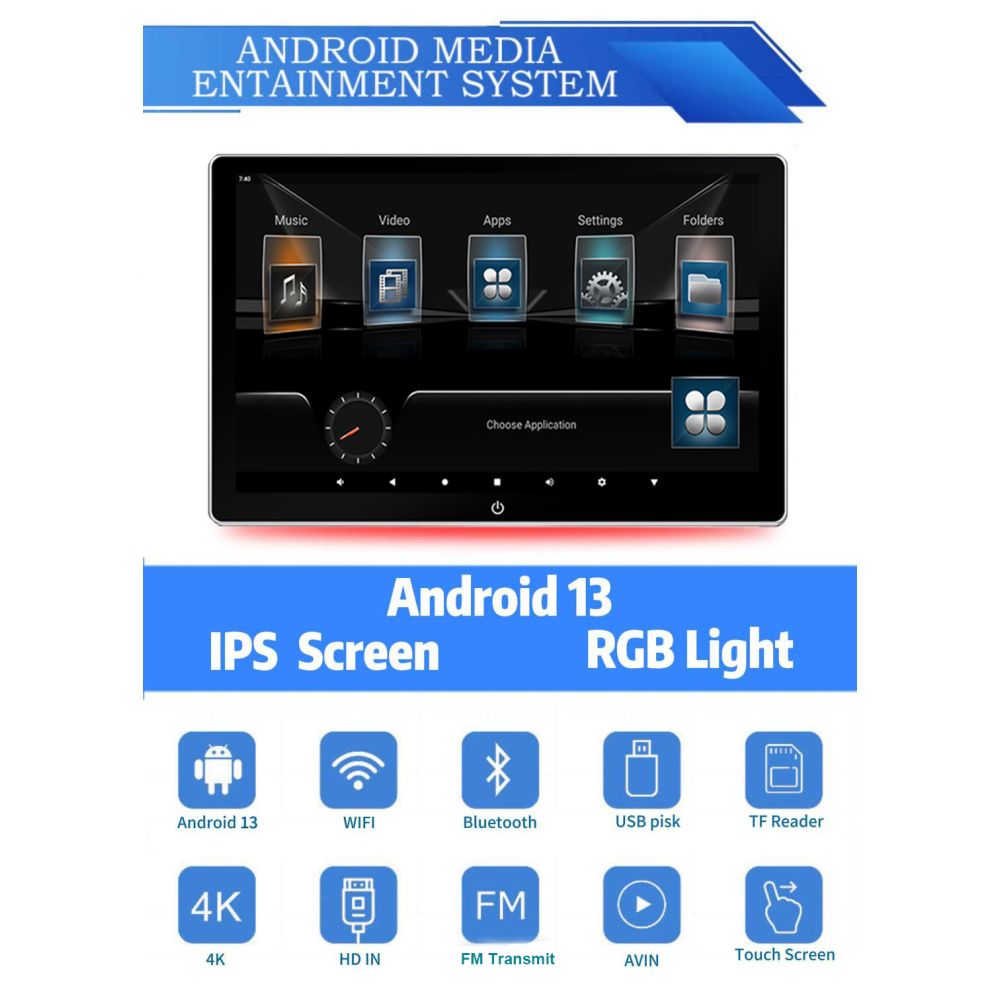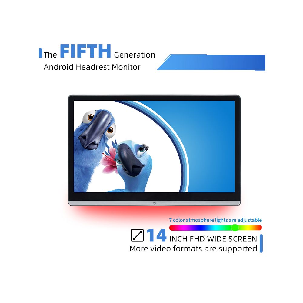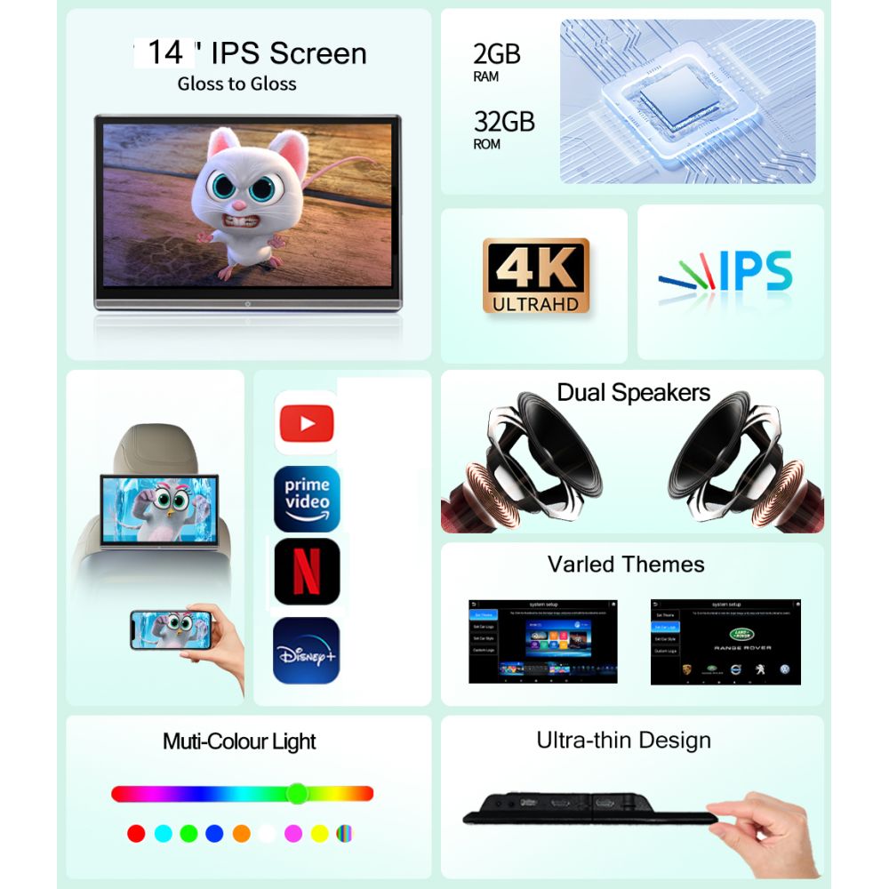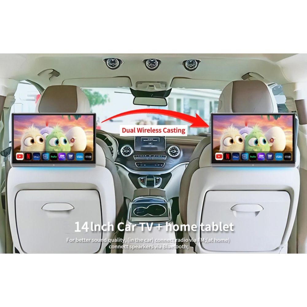 Skærm til nakkestøtte 14,1" - Med trådløs skærmdeling, FM, Bluetooth, WiFi, HDMI- og A/V-indgange - Android 13 styresystem