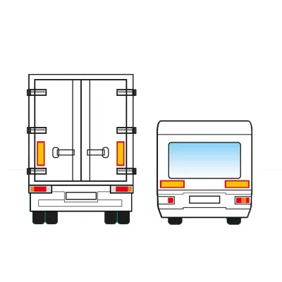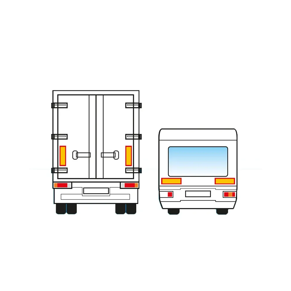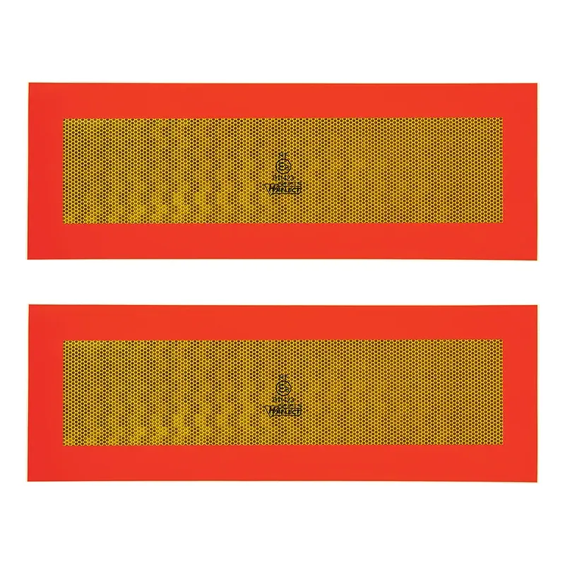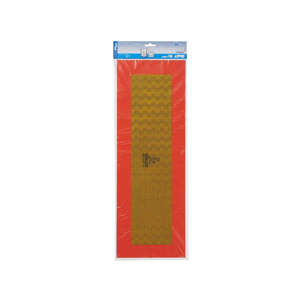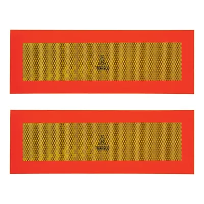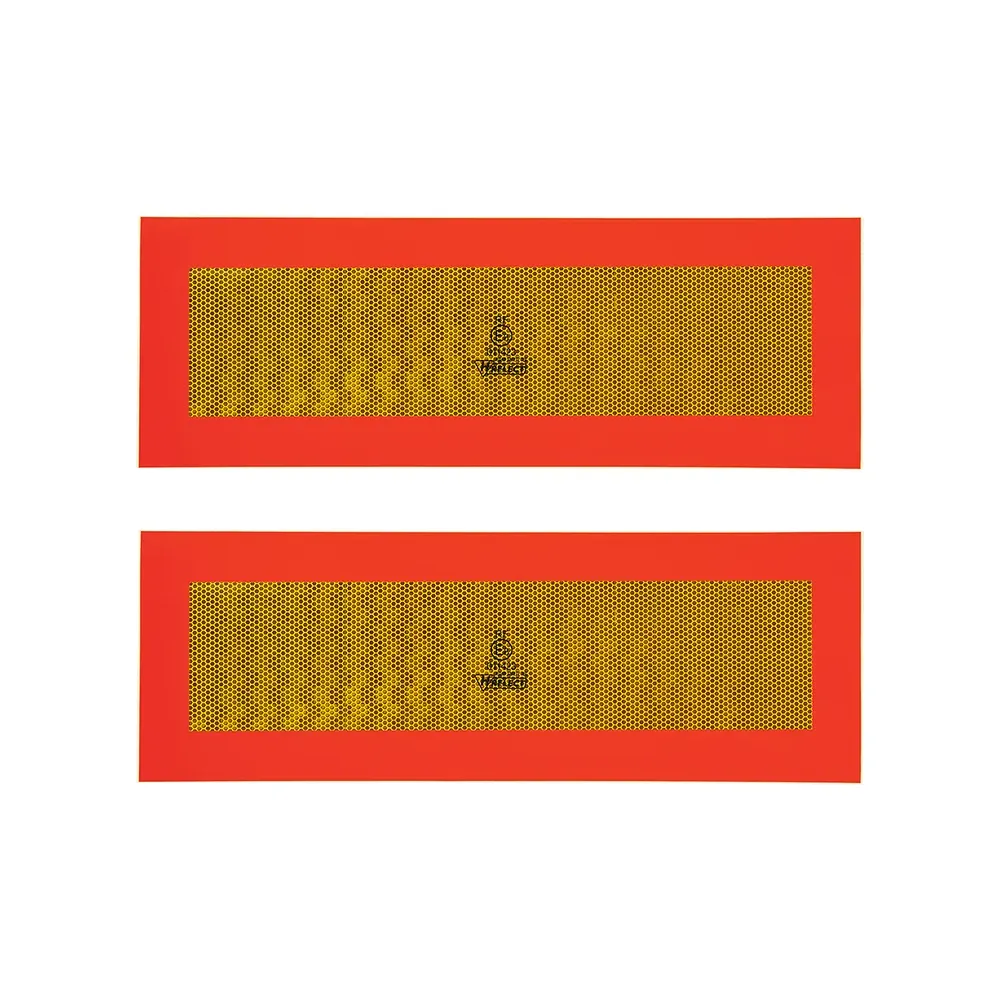 Universal selvklæbende refleks sæt rektangulær, størrelse 565 x 196 mm. Farve Rød og gul. Reflekserne er ECE70-godkendt. Den Gule har en høj intensivitets refleks, den Røde refleks er selvlysende.