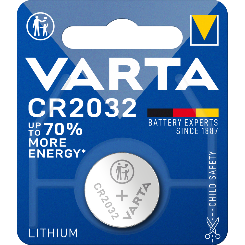 VARTA CR2032 er et højtydende lithium knapcellebatteri, designet til at levere langvarig og stabil strøm til små elektroniske enheder. Med en nominel spænding på 3V og en kapacitet på ca. 230 mAh sikrer dette batteri pålidelig drift i apparater med lavt til moderat strømforbrug. Batteriet er fremstillet i en kompakt størrelse på kun 20 mm i diameter og 3,2 mm i højde, hvilket gør det ideelt til pladsbesparende elektronik. Takket være lithium-teknologien byder CR2032 på lav selvafladning (under 1 % pr. år ved stuetemperatur), hvilket betyder, at batteriet bevarer sin kapacitet i op til 10 års lagerholdbarhed.