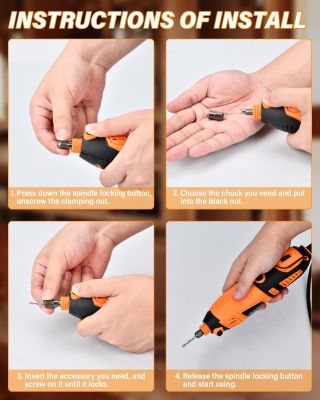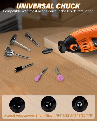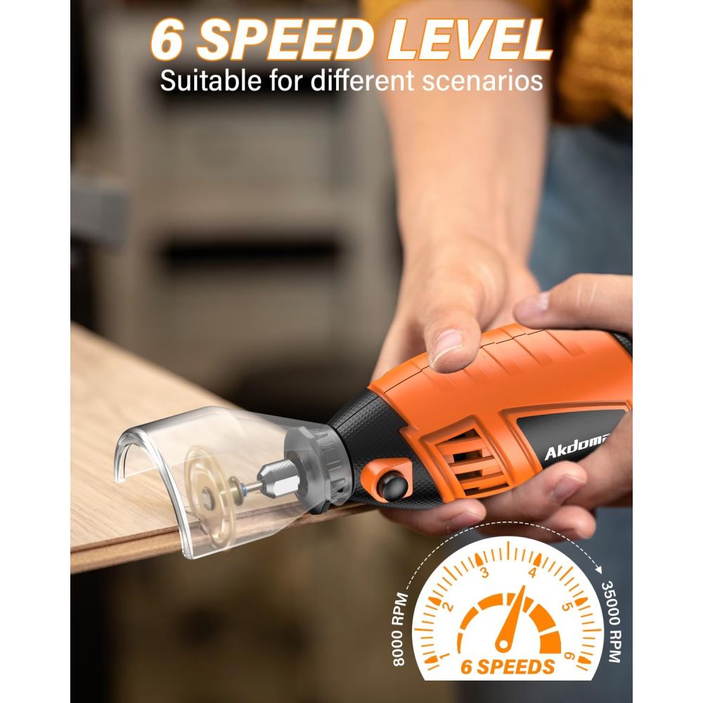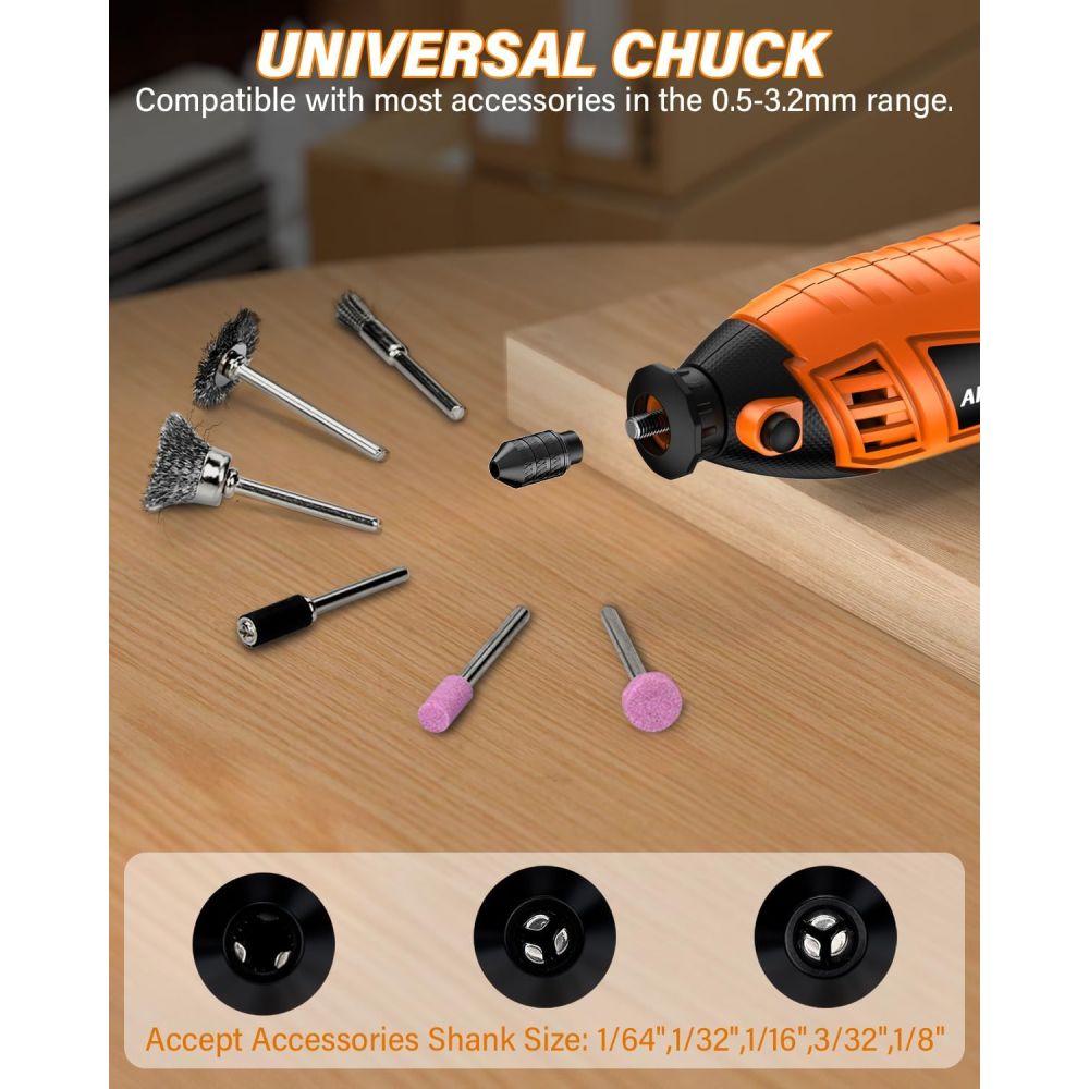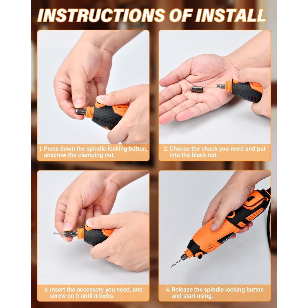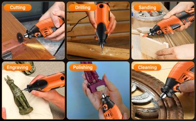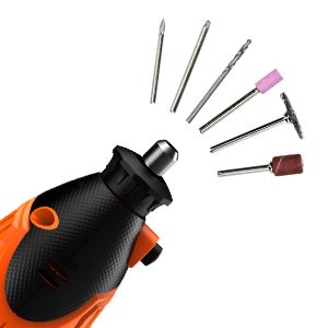 I denne plastkasse er der mange forskellige redskaber som f.eks. slibehjul, slibemuffer, bor, polering- og rengøringsredskaber. Ideel brug til træ, metal, plast og sten. Sliberen bliver leveret i en plastikkasse, så det er muligt at opbevare alle sine redskaber et sted. Der medfølger en vejledning på engelsk til diverse redskaber.