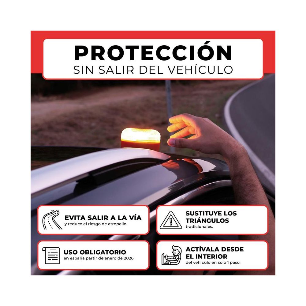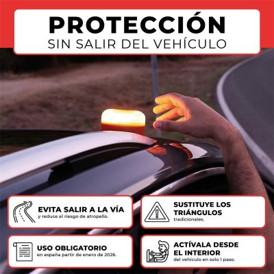 Emergency Beacon Geolocation V16 er et DGT 3.0-godkendt advarselsblink, der erstatter de traditionelle advarselstrekanter i Spanien. fra 1. januar 2026 er V16-advarselsblink obligatorisk i Spanien i henhold til gældende lovgivning. Advarselsblinket aktiveres nemt fra bilens kabine og placeres på taget ved hjælp af den indbyggede magnet. Dermed undgår du at forlade bilen i farlige situationer, hvilket reducerer risikoen for påkørsel.