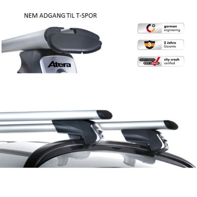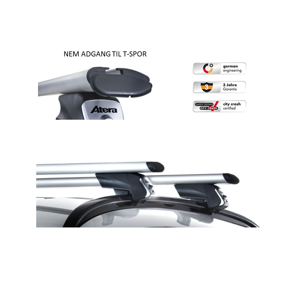 Med tagbøjler fra Atera er det ikke nødvendigt, at foretage yderligere justeringer og tilpasninger på bilen før du monterer bøjlerne. Du skal ej heller påmontere kitsæt og fødder - Pak ud og monter, det er NEMT! Atera tagbøjler leveres i én kasse og alt er klargjort fra fabrikken, det gælder uanset hvilken type af tagbøjler du ønsker. Tagstængerne fra Atera er TÜV-godkendte, og leveres med hele 3 års garanti.