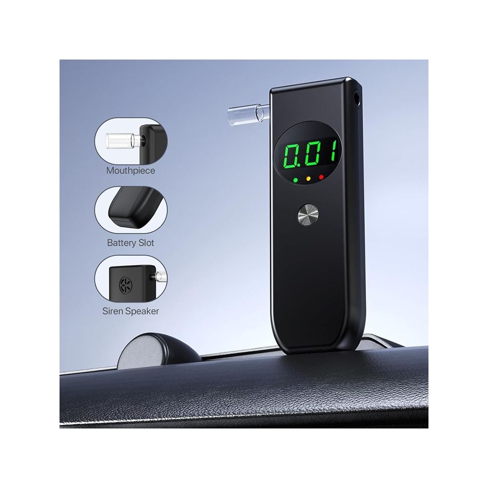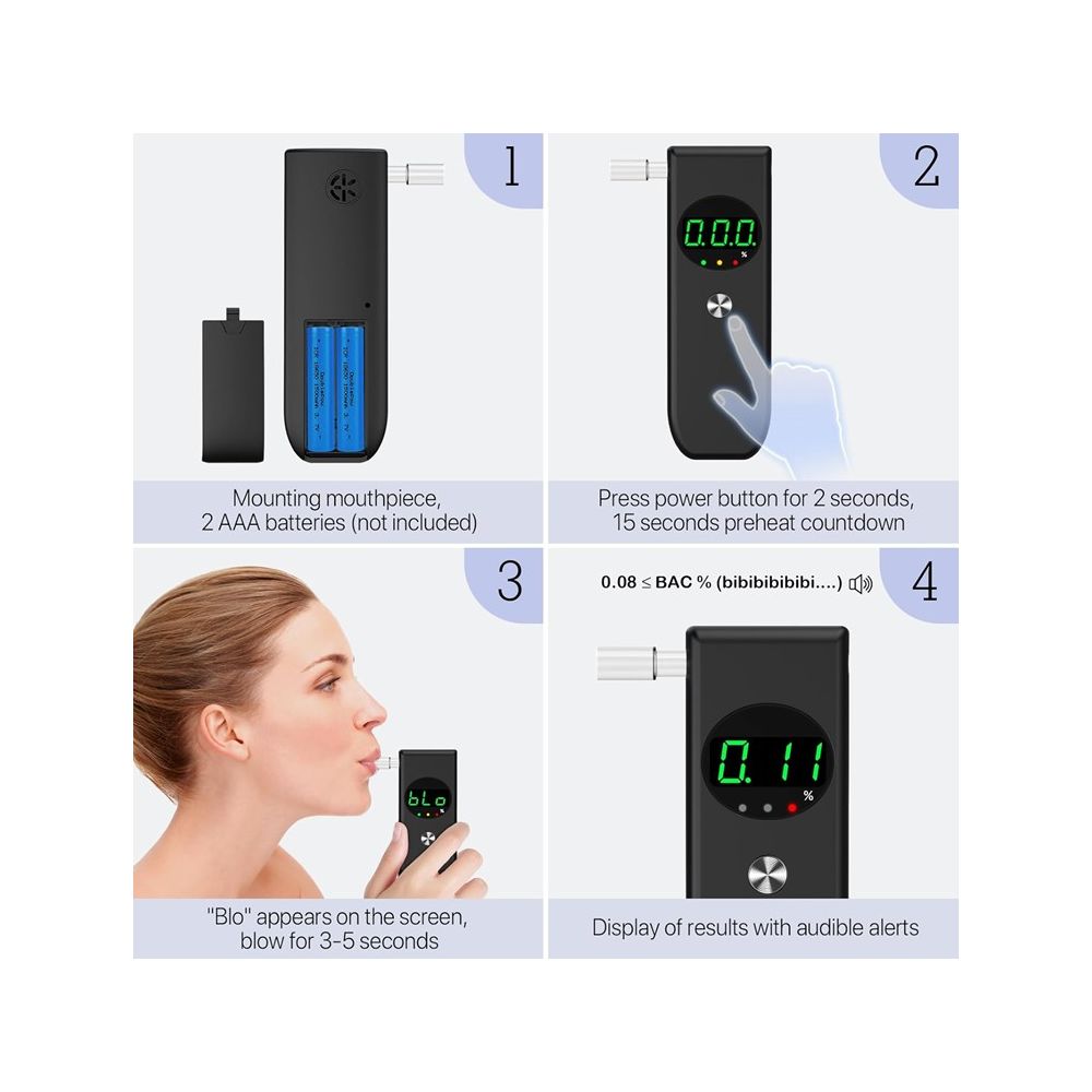 Dette alkometer er udstyret med en højfølsom halvleder-sensor, som sikrer meget præcise målinger. Enheden kræver ikke hyppig opladning, da den blot bruger 2 AAA-batterier (medfølger ikke). Hvert batteriskift giver mulighed for op til 300 målinger, og samlet kan alkometeret anvendes til omkring 2000 målinger, hvilket gør det både holdbart og langtidsholdbart. Betjeningen er enkel: tryk på tænd/sluk-knappen, vent 15 sekunder på opvarmning, og når “Blo” vises på skærmen, pust i mundstykket i 3-5 sekunder. Efter yderligere 5 sekunder vises resultatet tydeligt på LCD-skærmen. For mest præcise målinger anbefales det at teste tre gange med 2-3 minutters mellemrum og derefter tage gennemsnittet.
