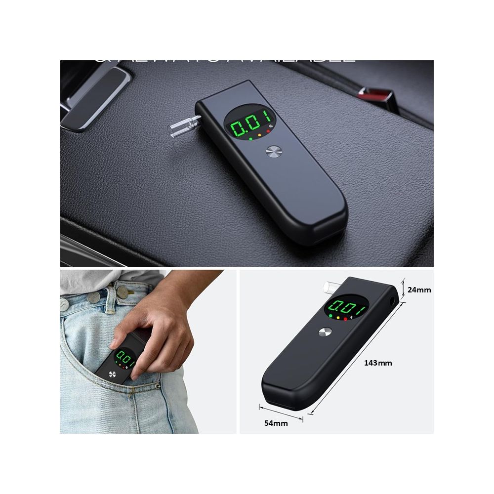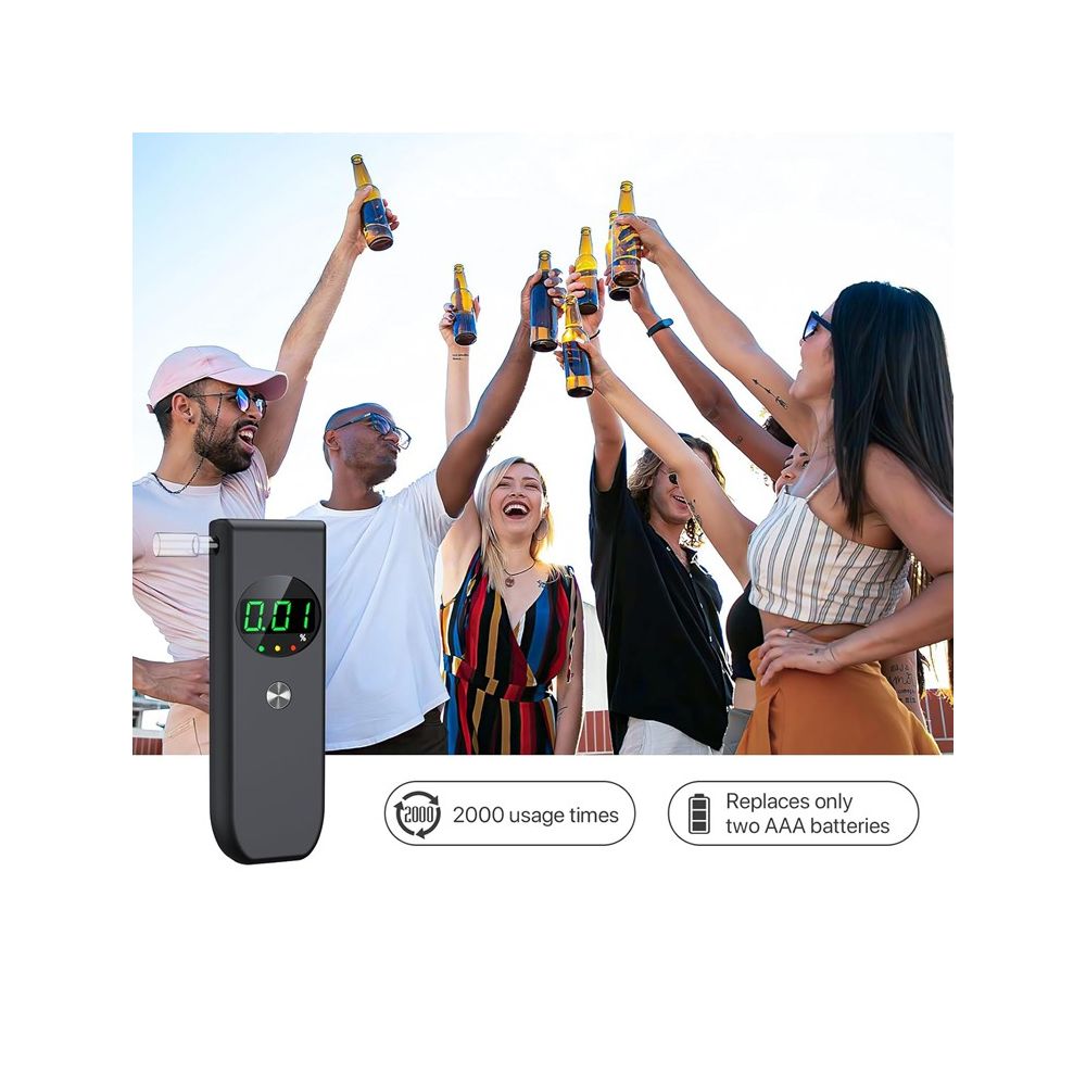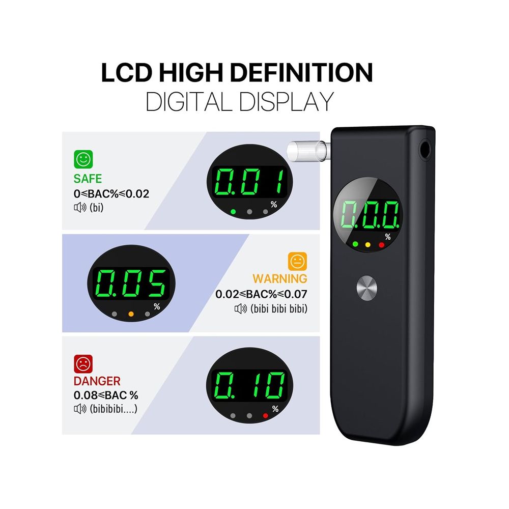 Resultatet aflæses nemt via både display og akustiske signaler. Hvis målingen er ≤ 0,2 promille, lyser skærmen grønt uden alarm. Ved 0,2–0,7 promille skifter den til gult lys og afgiver en kort alarm, mens et resultat på ≥ 0,8 promille aktiverer rødt lys samt en kraftig, lang alarm. Med sin kompakte størrelse og en vægt på kun 50 gram er alkometeret nemt at have med overalt, og der medfølger et praktisk opbevaringsetui. Det gør det ideelt til brug ved sociale arrangementer, fester, restaurantbesøg og andre aktiviteter, hvor du ønsker at holde styr på dit alkoholniveau og sikre en tryg og sikker kørsel.