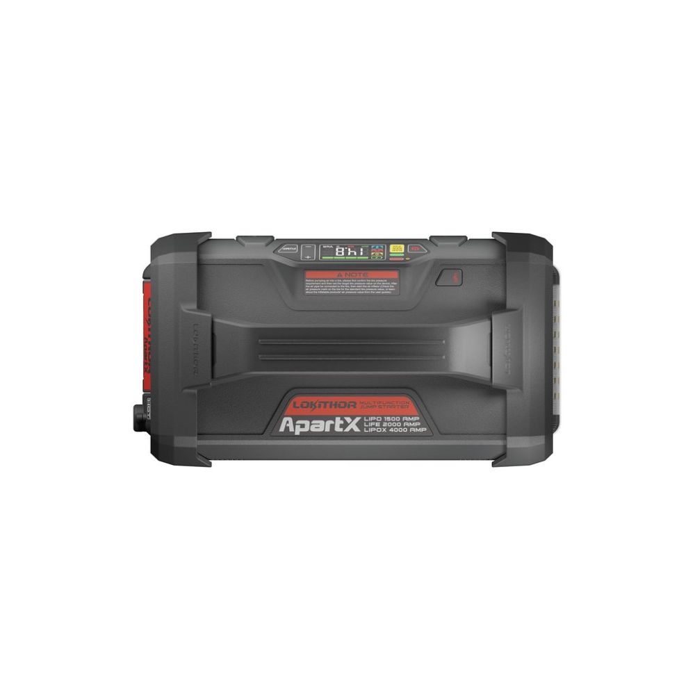 Lokithor ApartX jumpstarter med luftkompressor er den fleksible og kraftfulde løsning til dig, der vil være forberedt i enhver situation. Enheden anvender udskiftelige batterier, så du selv kan vælge den kapacitet, der passer til dit behov (batterier medfølger ikke som standard). Afhængigt af det valgte batteri leverer ApartX en imponerende startstrøm på 1500A, 2500A eller helt op til 4000A – nok til at starte både personbiler, varevogne og større køretøjer. Den integrerede luftkompressor leverer op til 10 BAR (150 PSI), hvilket sikrer hurtig og effektiv oppumpning af dæk, uanset om det gælder bil, motorcykel eller trailer.