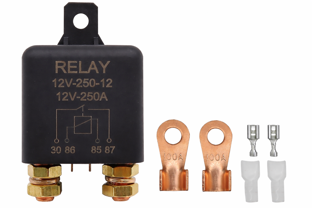 Kvalitets høj effekt relæ. Højt ydende 250 Amp. 12 volt. 2 stikben, 2 skrue stik og monteringsbeslag. Bemærk størrelse stikben 6,3 mm . skrue stik., Volt 12, Amp 250, Diagram nr. 1 R477,