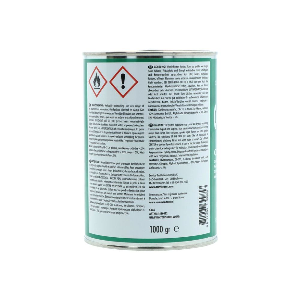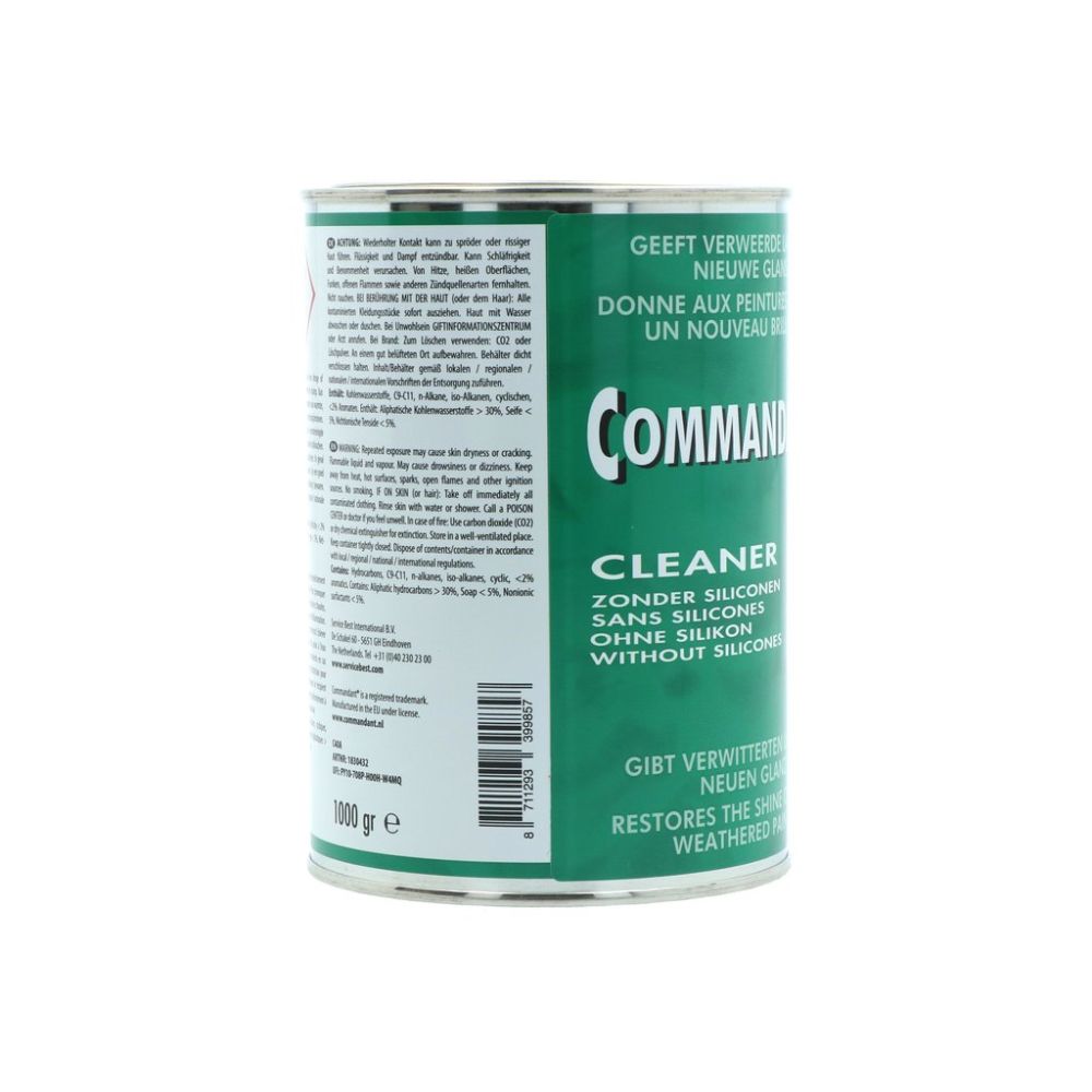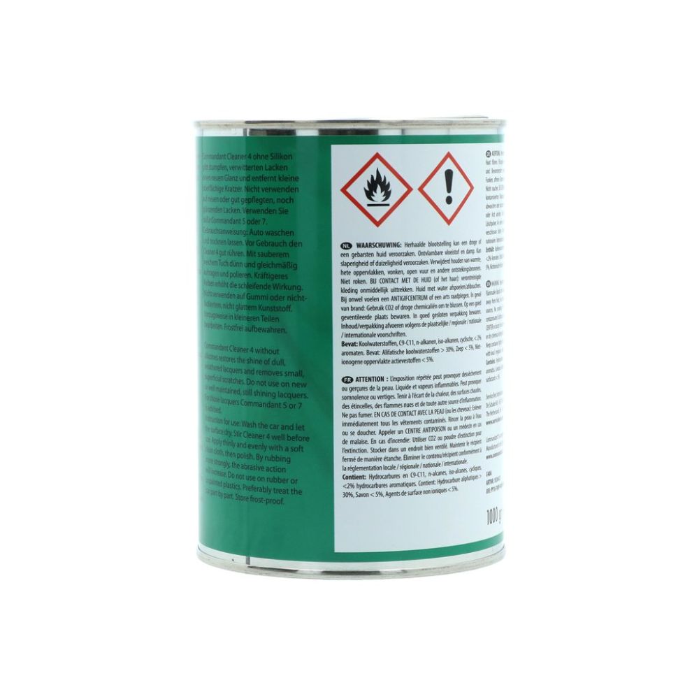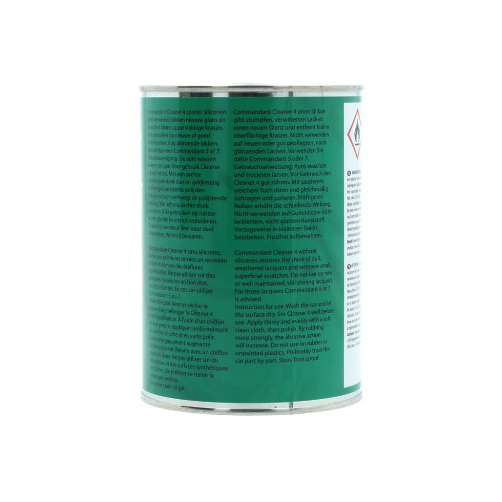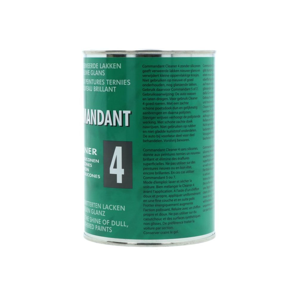 Commandant Cleaner 4 - den velkendte klassiker i den grønne dåse - er løsningen, når din bils lak har mistet sin glans! Denne effektive, silikonefri lakrens fjerner nemt matte belægninger, oxidering og små overfladiske ridser fra falmet lak og genskaber den dybe, flotte glans. Perfekt til ældre eller slidte lakker, der trænger til nyt liv. Har du en ny eller velholdt lak, der allerede skinner? Så anbefales i stedet Commandant 5 eller Commandant 7.