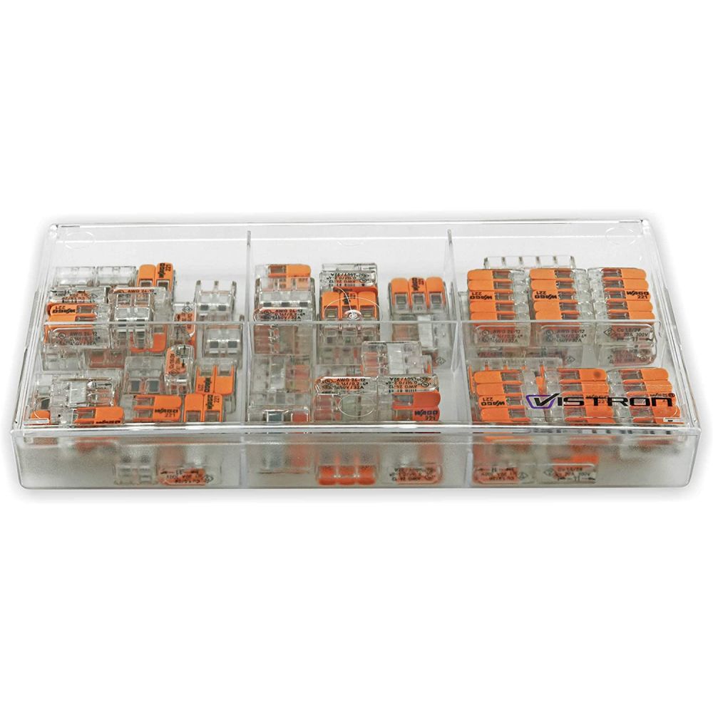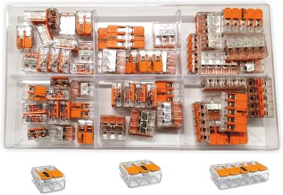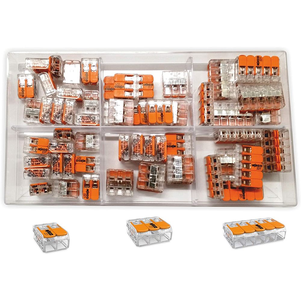 Højkvalitets WAGO Serie 221 samlemuffe sortiment med 75 dele. Ved brug af WAGOs serie 221 fjedersamlemuffe får du mulighed for at lave en hurtig og nemmere samt en mere sikker installation. Muffen tilbyder placering af en leder i hvert klemmerum, men i selve samlemuffen har man også mulighed for at lave en sikker samling med flere leder.