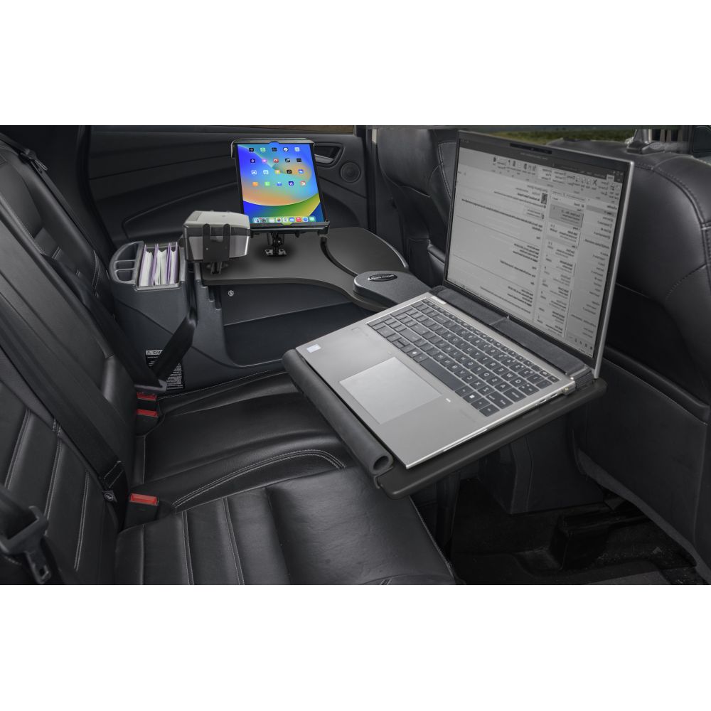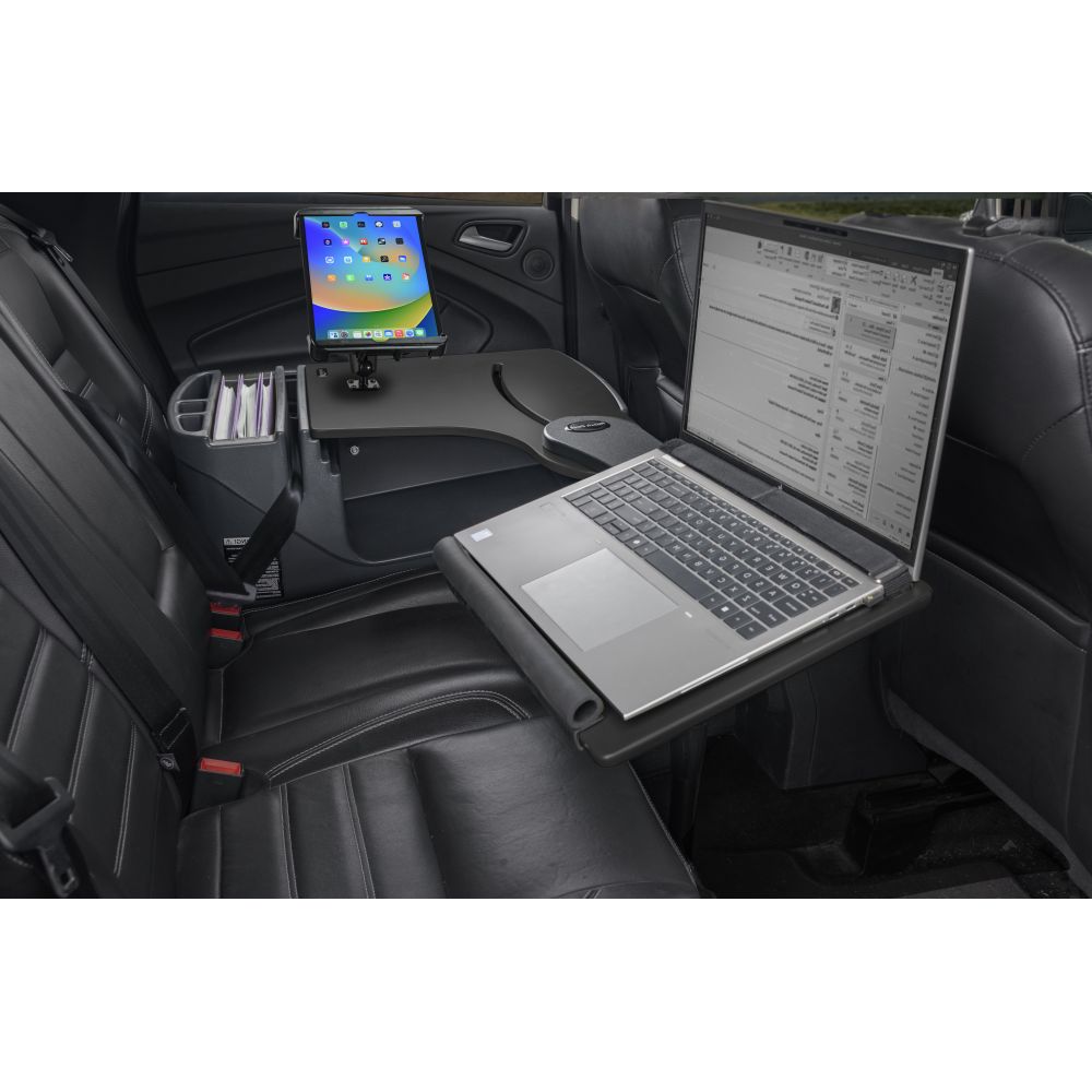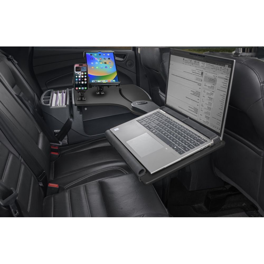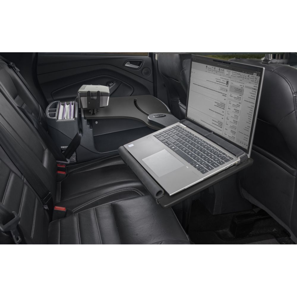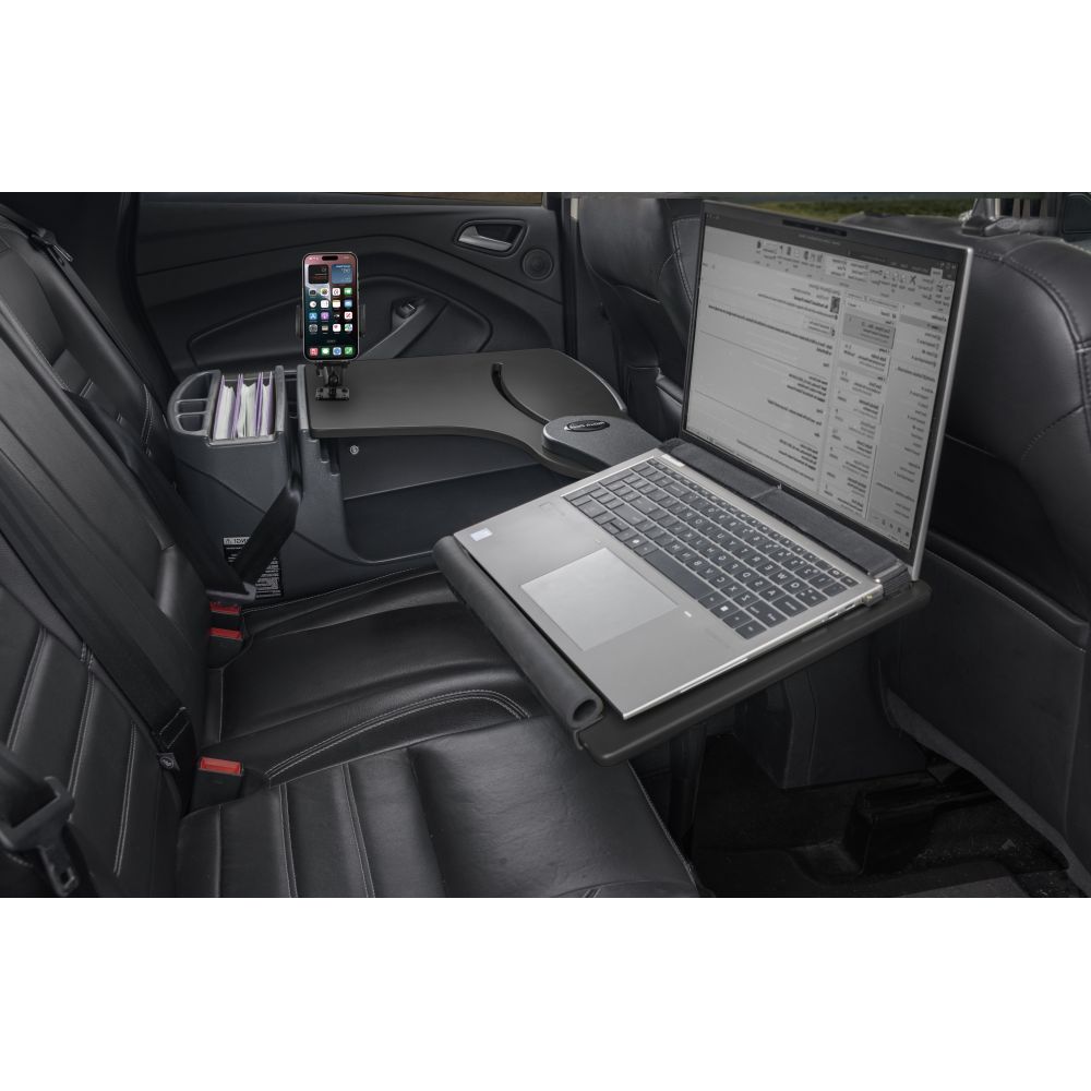 Den skridsikre bakke og sikkerhedsstrop sørger for, at din computer bliver, hvor den skal, mens du arbejder. Arbejdsfladen er monteret på en justerbar kuglearm, der gør det muligt at vippe og tilpasse vinklen, så du kan skrive og arbejde mere ergonomisk. Under skrivefladen finder du et skjult opbevaringsrum, ideelt til dokumenter, kabler og andre kontorartikler, så du altid har styr på det hele. Denne mobil office er ideel til brug på bagsædet af bilen. Ideel til brug på bagsædet af køretøjet, placeret bag førersædet.