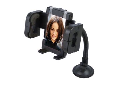 Universal holder med fotoramme. Velegnet til alle typer af enheder som mobiltelefoner , PDA'er og navigationssystemer. Justerbar i bredden 40-120 mm.Højde på holder 34-70 cm. Fodstøtte justerbar. Med fotoramme 45 x 70 mm. Med fleksibel hals og sugekop, clips til fastgørelse i ventilationsgitter. Monteres let og enkelt med sugekop på ruden eller i luftdysen ved instrumentbrættet.