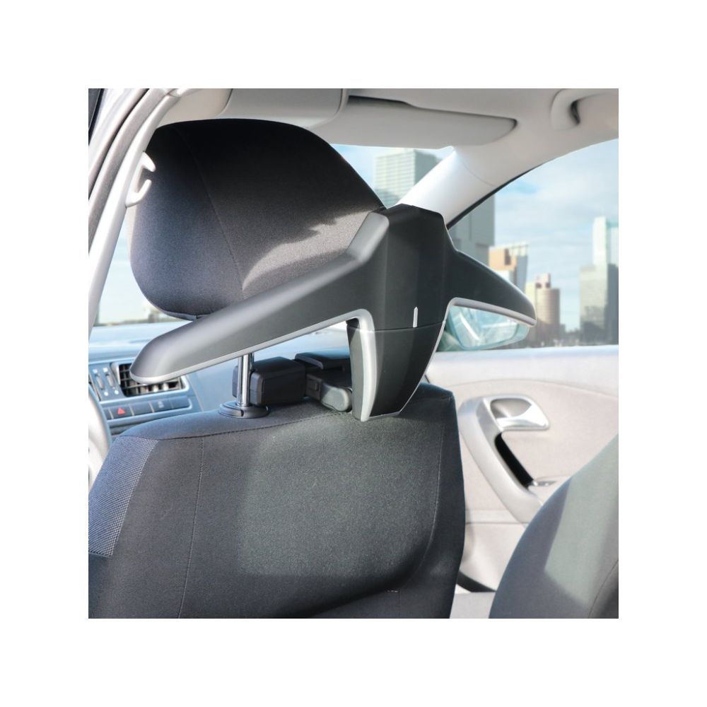 Tøjbøjlen er lavet af ABS plast. Produktet er let at montere, da det monteres ved at blive sat fast til stængerne ved nakkestøtten. Passer til alle standardmodeller af sæder, herunder også dem med ikke-aftagelige nakkestøtter, så længe de har synlige stænger som holderen kan klikkes fast til. Se evt. billeder.