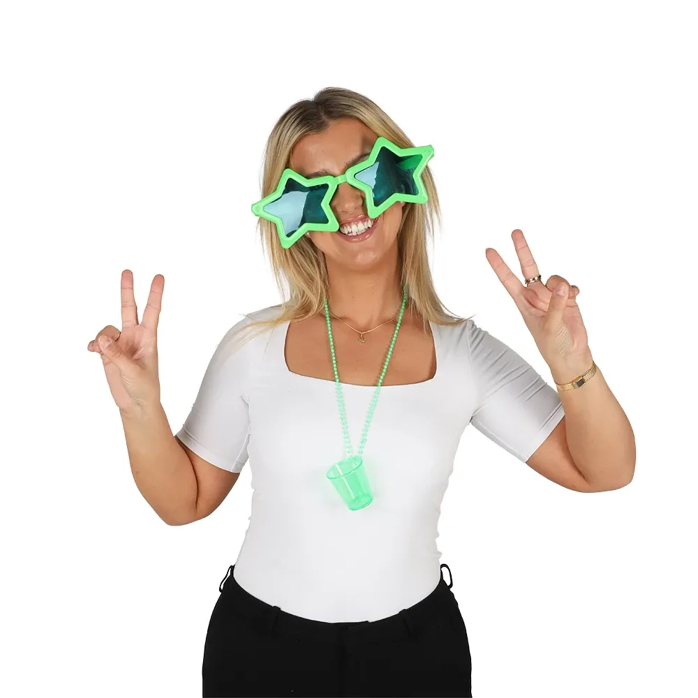 Gør dit outfit ekstra iøjnefaldende med disse trendy neon grønne stjernebriller! Det unikke stjernedesign kombineret med den klare neonfarve giver et legende og festligt look, der med garanti skiller sig ud - uanset om det er til Halloween, temafest eller festival.
