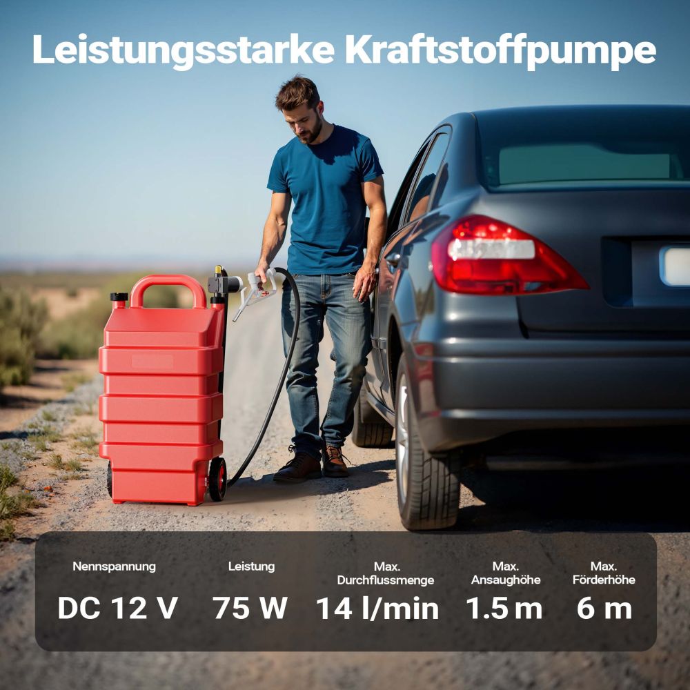 Den mobile brændstofbeholder er den perfekte løsning for alle, der har brug for en pålidelig og fleksibel måde at tanke brændstof på. Med en kapacitet på 60 liter giver den rigelig plads til hurtig og effektiv optankning af forskellige køretøjer og maskiner. Den kompakte konstruktion med målene 43x26x85 cm gør den nem at transportere og ideel til brug, hvor pladsen er begrænset. Udstyret med en kraftfuld 12V pumpe med en effekt på 75 W sikrer tankstationen en maksimal gennemstrømningshastighed på 14 liter pr. minut, hvilket muliggør en effektiv og tidsbesparende brændstofpåfyldning. Med en maksimal løftehøjde på 6 meter og en sugehøjde på 1,5 meter fungerer anlægget stabilt og driftssikkert, selv under krævende forhold.
