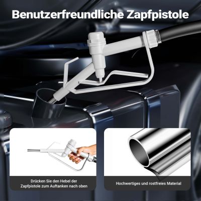 Den mobile tankstation er designet med fokus på enkel og sikker betjening. Den leveres med et fire meter langt kabel og batteriklemmer, som giver en fleksibel strømforsyning direkte fra et køretøj eller en ekstern strømkilde. Alternativt kan den tilsluttes via et 12V stik. Tankanlægget er udstyret med en én meter sugeslange til påfyldning og en to meter udløbsslange til brændstofoverførsel. Den medfølgende tankpistol gør det nemt at styre brændstofstrømmen præcist, så påfyldningen kan foregå sikkert og uden spild.