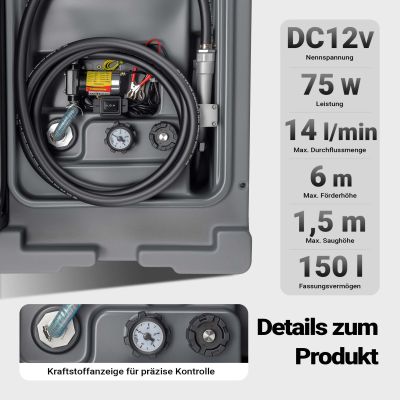 Den mobile brændstoftank er den ideelle løsning for alle, der har brug for en fleksibel og pålidelig måde at tanke køretøjer og maskiner på. Med en kapacitet på 150 liter giver tankanlægget rigelig plads til effektiv påfyldning af brændstof, uanset om det drejer sig om biler, landbrugsmaskiner eller entreprenørkøretøjer. Den kompakte konstruktion gør anlægget nemt at transportere og praktisk at opbevare, samtidig med at det giver maksimal funktionalitet på minimal plads. Den mobile tankstation er udstyret med en kraftfuld 12V pumpe med en effekt på 75W, som sikrer en gennemstrømningshastighed på op til 14 liter pr. minut. Dette gør det muligt at tanke hurtigt og effektivt, selv under krævende forhold. Med en løftehøjde på op til 6 meter og en sugehøjde på 1,5 meter fungerer anlægget stabilt og driftssikkert, selv når det bruges i terræn eller på vanskeligt tilgængelige steder.