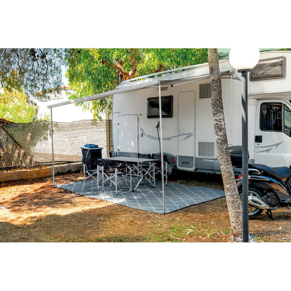 Praktisk og slidstærk teltdug/telttæppe, der kombinerer lav vægt med høj funktionalitet. Ideel til brug i fortelte, på terrassen, i haven eller på campingturen, hvor du ønsker et rent og komfortabelt underlag. Tæppet er designet til at give optimal beskyttelse mod underlaget og samtidig øge komforten ved ophold udendørs. Det robuste materiale sikrer lang holdbarhed, mens den lette konstruktion gør det nemt at transportere og håndtere. De integrerede øjer gør det muligt at fastgøre tæppet sikkert til jorden, så det bliver liggende stabilt - selv i blæsende vejr. Overfladen er nem at rengøre og tørrer hurtigt, hvilket gør det særligt velegnet til hyppig brug i skiftende vejrforhold.