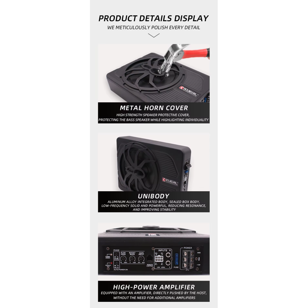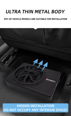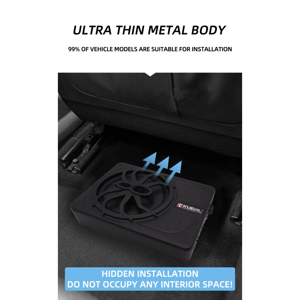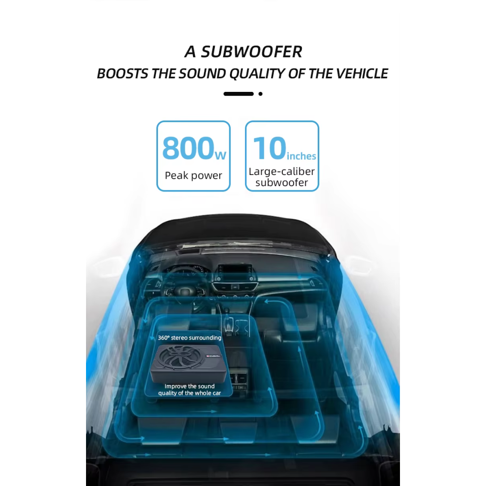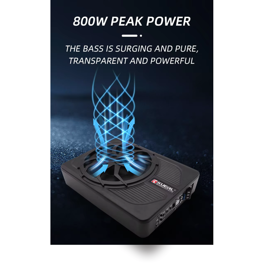Aktiv 10" subwoofer på hele 800W og med en højde på kun 7 cm. Subwooferen leverer dyb bas, mens den optager lidt plads på samme tid. Subwooferen kan let skjules og tilføjer enestående ydeevne til ethvert bilstereoanlæg. Det robuste aluminiumskabinet i sort, giver subwooferen et unik design. Peak på denne subwoofer er 800W (RMS 400W) og kræver en minimal mængde strøm fra din bil. Intelligent elektronisk design til pålidelig og exceptionel ydeevne. Passer til alle autoradioer både originale og eftermonterede. Kompakt design, ideel til montering under bilens sæde eller oppe under instrumentbordet. Den aktive subwoofer kan også monteres i båden, campingvognen eller autocamper. Leveres med div. kabler til montering.