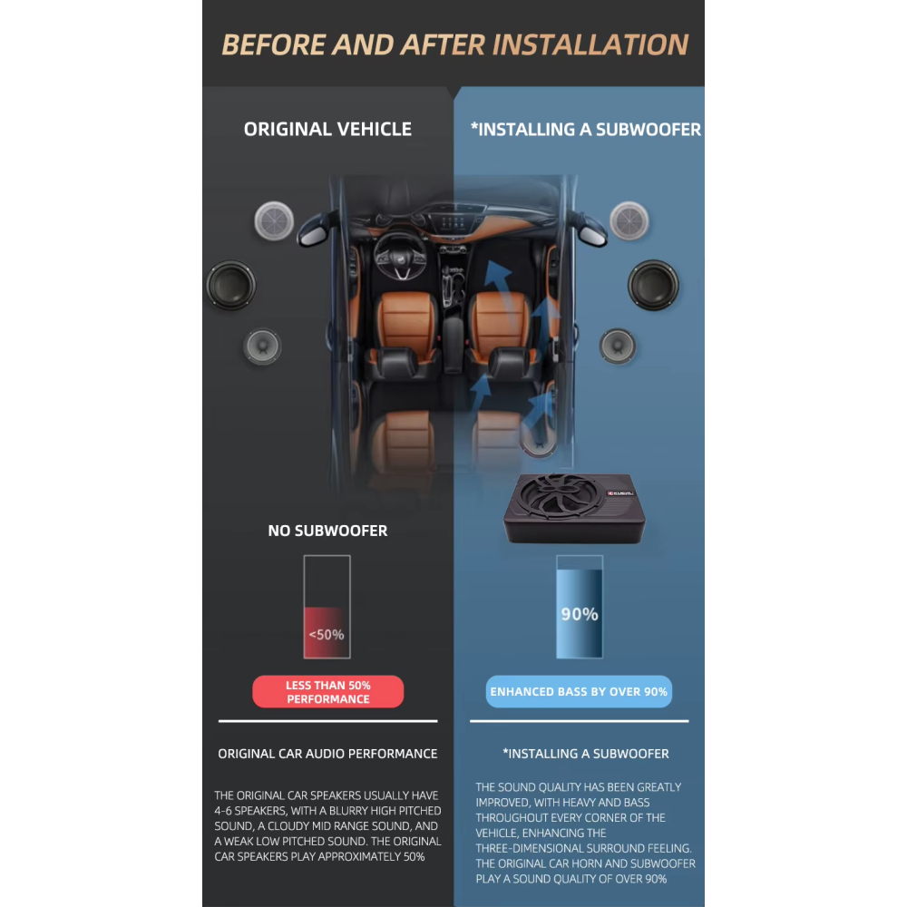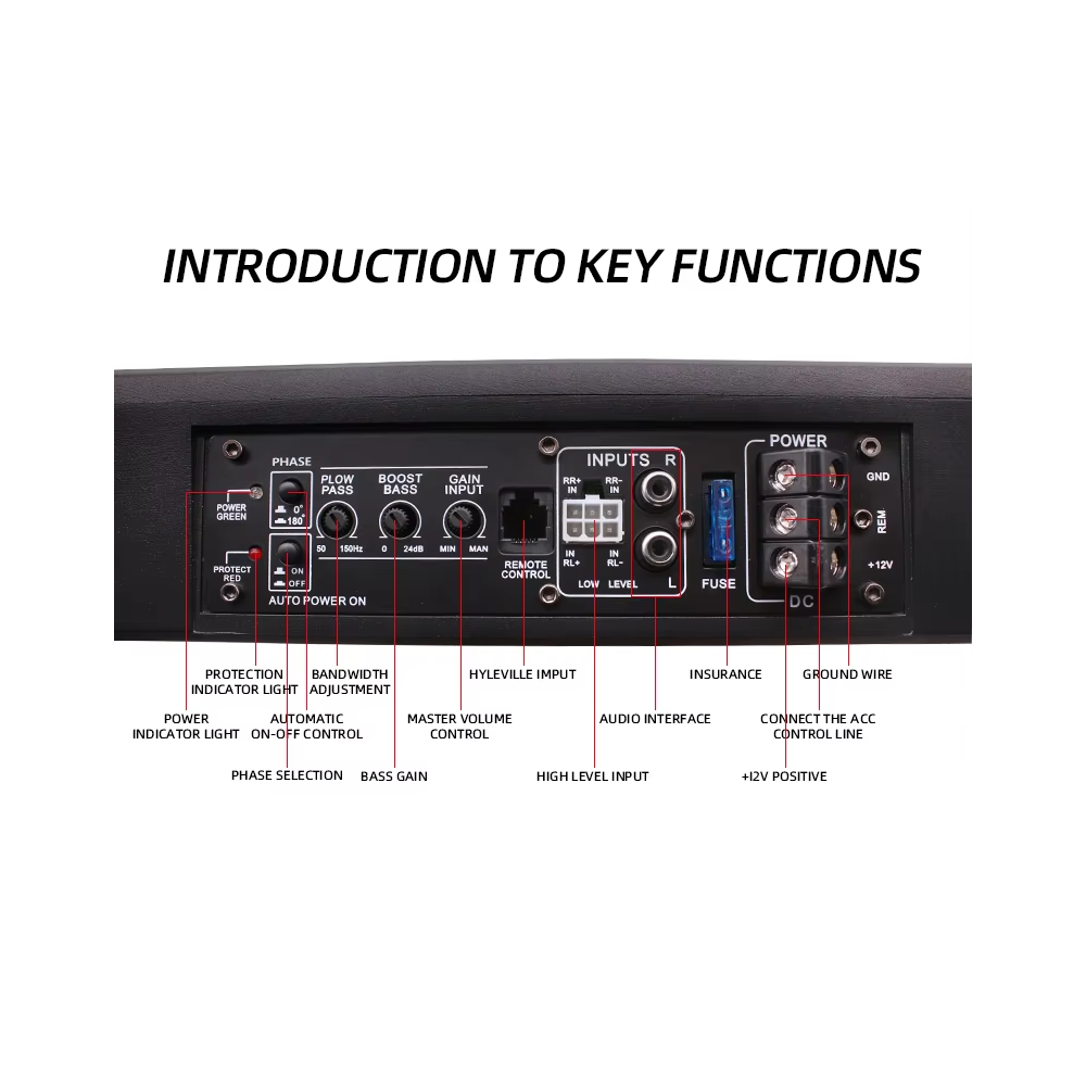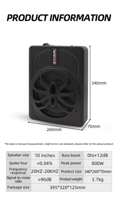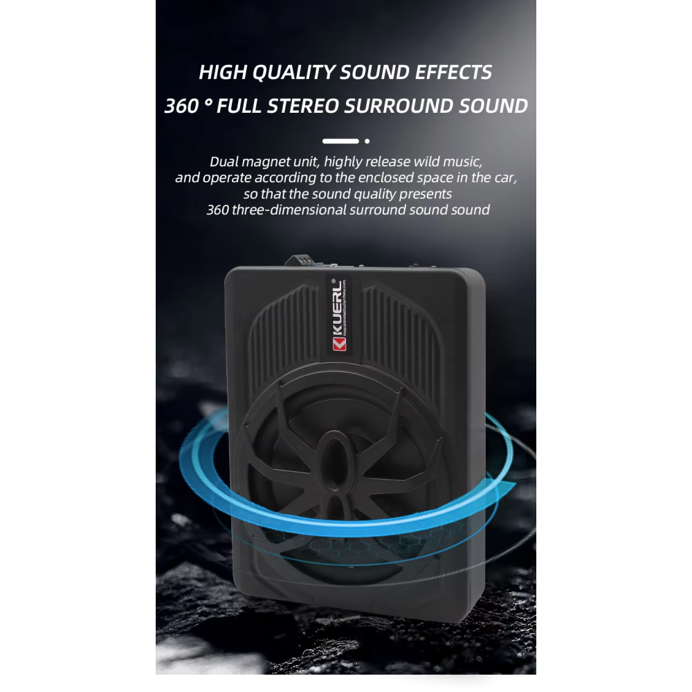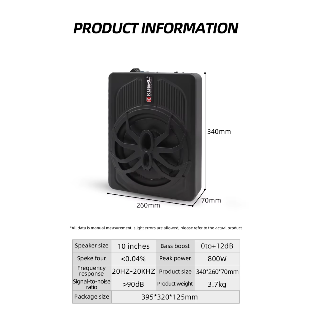 Aktiv 10" subwoofer på hele 800W og med en højde på kun 7 cm. Subwooferen leverer dyb bas, mens den optager lidt plads på samme tid. Subwooferen kan let skjules og tilføjer enestående ydeevne til ethvert bilstereoanlæg. Det robuste aluminiumskabinet i sort, giver subwooferen et unik design. Peak på denne subwoofer er 800W (RMS 400W) og kræver en minimal mængde strøm fra din bil. Intelligent elektronisk design til pålidelig og exceptionel ydeevne. Passer til alle autoradioer både originale og eftermonterede. Kompakt design, ideel til montering under bilens sæde eller oppe under instrumentbordet. Den aktive subwoofer kan også monteres i båden, campingvognen eller autocamper. Leveres med div. kabler til montering.