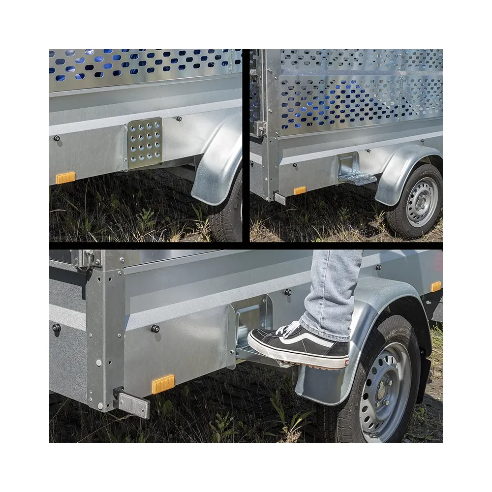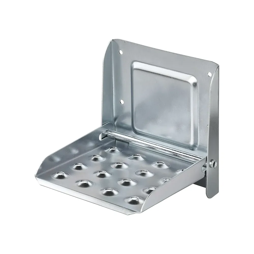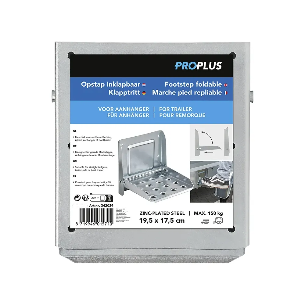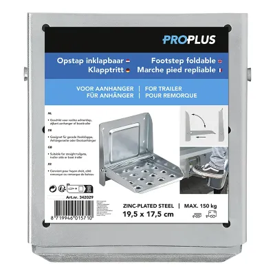 Klaptrin for lettere at kunne træde op i ladet på lastbil eller varevogn. Kan også med fordel anvendes til trailer. Fremstillet i galvaniseret stål. Når trinnet ikke anvendes, klappes det blot sammen, så det ikke stikker ud. Monteres nemt for enden af ladet, eller på bagenden af traileren med skruer (medfølger ikke). Produktet måler 195x175 mm (når trinnet er slået ud)