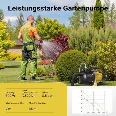 Denne selvansugende havepumpe med en kapacitet på 2.800 liter i timen er en effektiv og pålidelig løsning til alle dine vandingsbehov i haven. Uanset om du ønsker at vande planter, vedligeholde din havedam, udnytte opsamlet regnvand eller pumpe vand fra en brønd, får du en fleksibel pumpe, der klarer opgaven uden besvær. Med en effekt på 600W og en maksimal løftehøjde på 35 meter sikrer pumpen en stabil og kraftig vandforsyning, så du altid har det nødvendige tryk til rådighed. Den høje gennemstrømning gør det nemt at opnå en effektiv og jævn vanding, selv ved større områder.