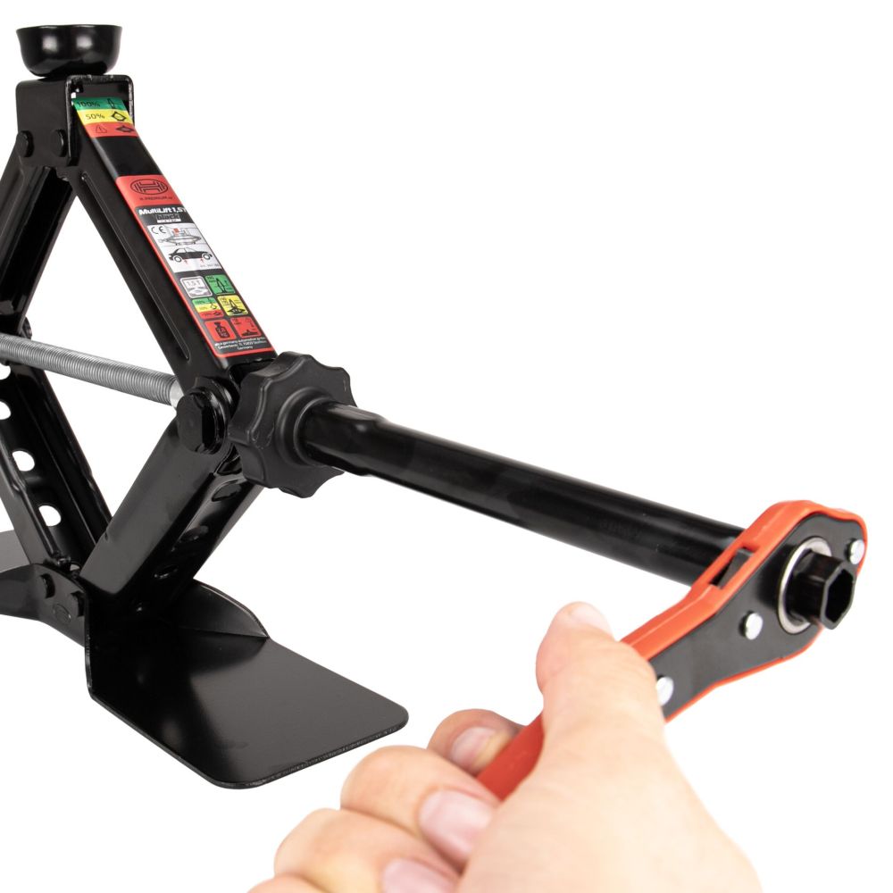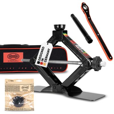 HEYNER® MultiLift M Black er en højkvalitets saksedonkraft til køretøjer med en totalvægt på op til 1,5 ton og er ideel til alt fra mikrobiler til øvre mellemklasse. Den er fremstillet i robust, pulverlakeret stål og har et elegant sort design. Løftehøjden spænder fra 112 til 395 mm, og den ekstra stabile bundplade har en rummelig anlægsflade på 30 x 8 cm. Den udskiftelige, 360° drejbare løftesko med slids sikrer et sikkert løftepunkt og kompatibilitet med ekstra gummipuder (f.eks. til Tesla, Mercedes, Audi og BMW).
