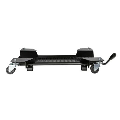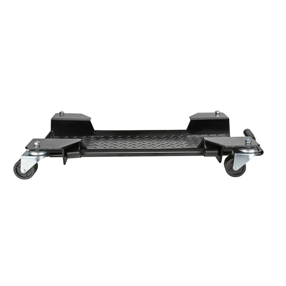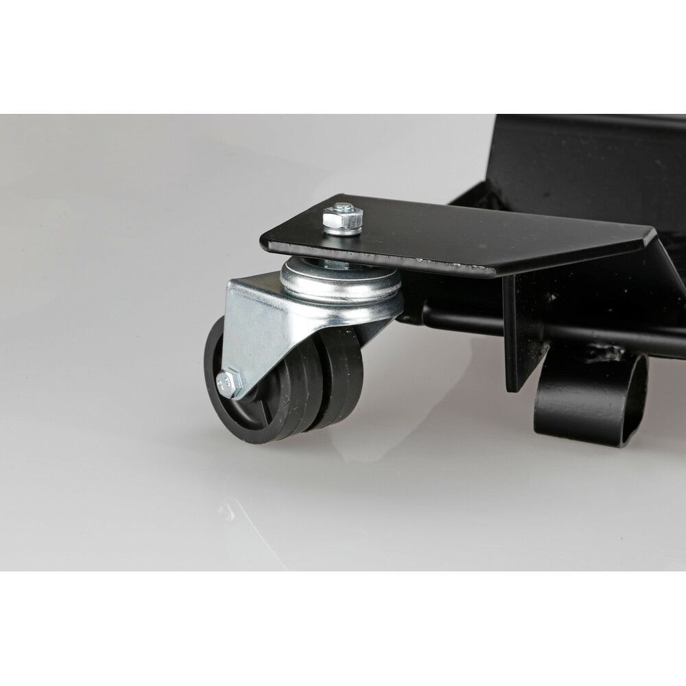 Denne motorcykeldolly er den perfekte dolly til at parkere eller flytte din motorcykel hurtigt, sikkert og ubesværet med mindst mulig plads. Den er udstyret med fire 360° dobbelt drejelige hjul, med fremragende rullende egenskaber. Hjuldolly-platformen er fremstillet af robust stål og er ikke kun holdbar i forhold til lignende produkter, men også nem at bruge. Det integrerede låsehåndtag på fronten af dollyen sikrer at dolly ikke ruller. For mere stabilitet er platformen dækket med en skridsikker gummi.