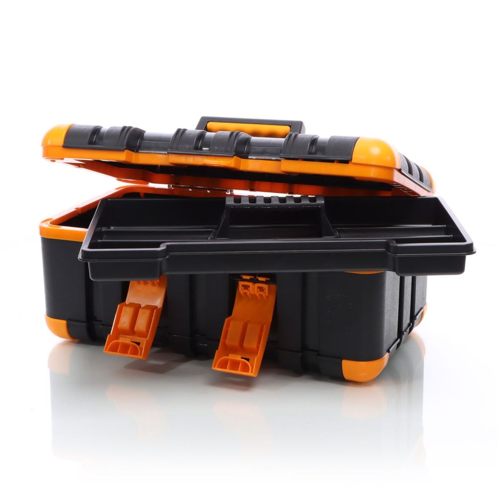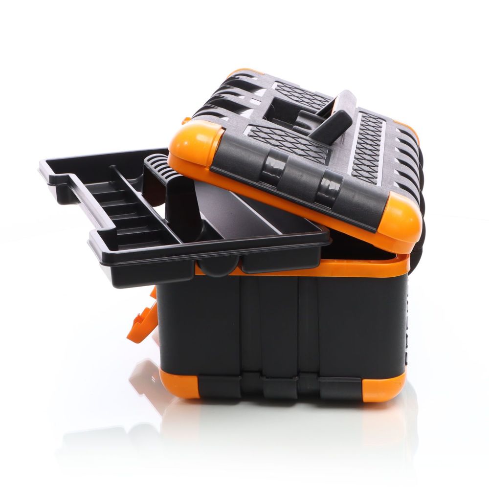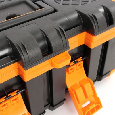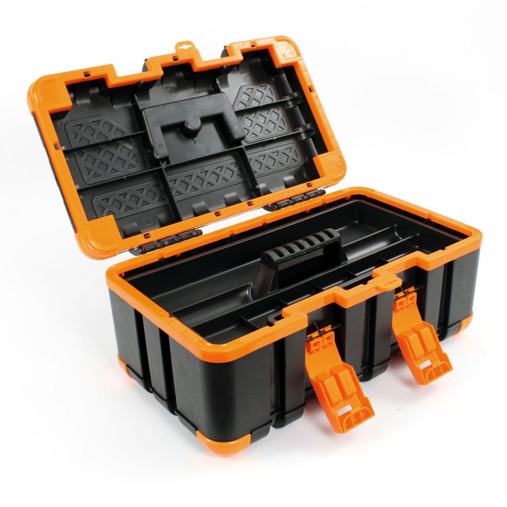 Værktøjskassen er fremstillet af stød- og slagfast plast. Takket være det robuste materiale er den iøjnefaldende grå-orange værktøjskasse ideel til brug på byggepladsen eller på værkstedet. Skridsikre gummihætter på hjørnerne sikrer et sikkert fodfæste. Værktøjskassen kan derfor endda bruges som et trin op til 90 kg, fx til at slå søm længere op i væggen. Plastkassen har et praktisk håndtag, der kan foldes ind i låget, når det ikke er i brug. For at sikre, at der ikke falder værktøj ud under transport, kan værktøjskassen lukkes sikkert med to snaplåse. Uanset om du er professionel eller gør-det-selv-entusiast, er denne værktøjskasse et must-have for enhver håndværker og bør ikke mangle på ethvert værksted.