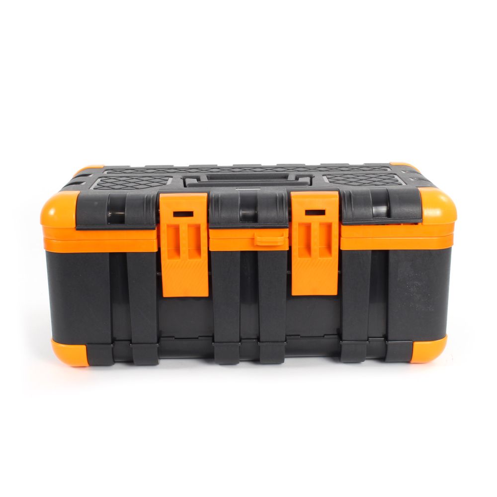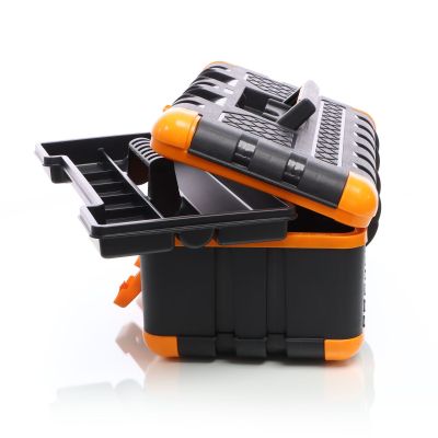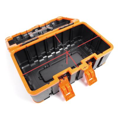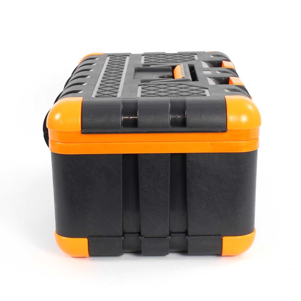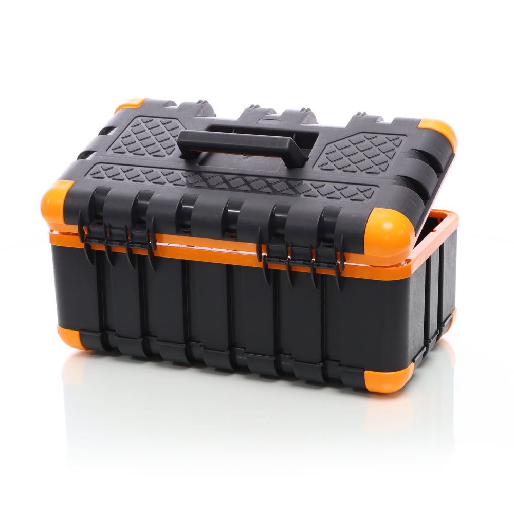 Værktøjskassen er fremstillet af stød- og slagfast plast. Takket være det robuste materiale er den iøjnefaldende grå-orange værktøjskasse ideel til brug på byggepladsen eller på værkstedet. Skridsikre gummihætter på hjørnerne sikrer et sikkert fodfæste. Værktøjskassen kan derfor endda bruges som et trin op til 90 kg, fx til at slå søm længere op i væggen. Plastkassen har et praktisk håndtag, der kan foldes ind i låget, når det ikke er i brug. For at sikre, at der ikke falder værktøj ud under transport, kan værktøjskassen lukkes sikkert med to snaplåse. Uanset om du er professionel eller gør-det-selv-entusiast, er denne værktøjskasse et must-have for enhver håndværker og bør ikke mangle på ethvert værksted.