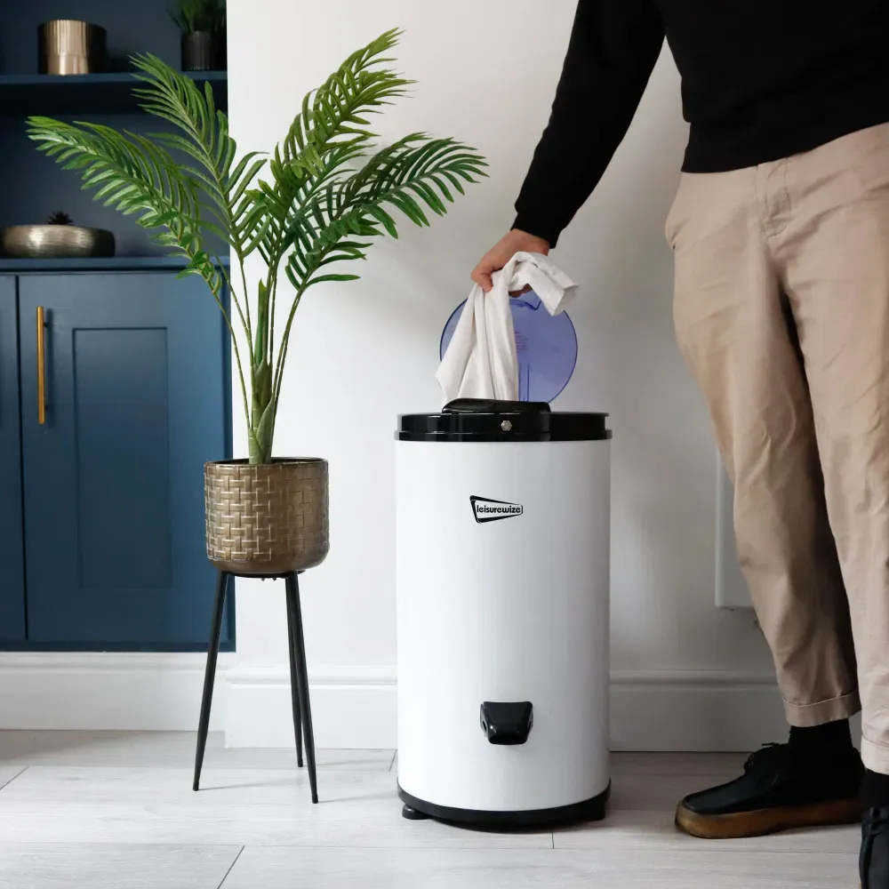 Denne bærbare og energieffektive centrifuge er den perfekte løsning til camping, autocampere, campingvogne, studerende og små hjem – og den er også ideel som nødløsning, hvis din vaskemaskine går i stykker, og du er nødt til at håndvaske dit tøj. Centrifugen er utrolig nem at bruge: Stil den på en plan overflade, placer en spand under tuden (spand medfølger ikke), læg dit vasketøj i tromlen, luk låget og tænd.