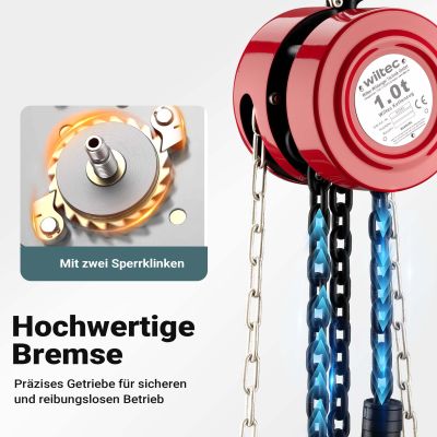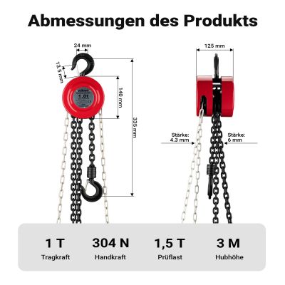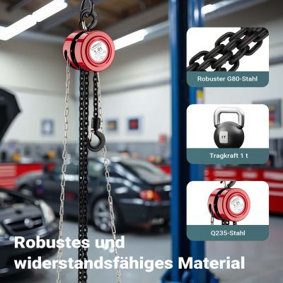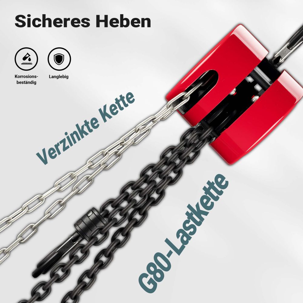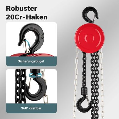 Den lange kæde giver fleksibilitet til løft i forskellige højder og arbejdssituationer, mens den drejelige lastekrog gør det lettere at placere og justere lasten, også hvor pladsen er trang. Konstruktionen i solidt stål sikrer høj holdbarhed og stabil drift over lang tid, og den beskyttende overflade bidrager til modstandsdygtighed over for slid og korrosion. Samlet set er der tale om et funktionelt og effektivt løfteredskab, der egner sig både til professionelle opgaver og krævende private projekter, hvor der stilles krav til styrke, kontrol og driftssikkerhed.