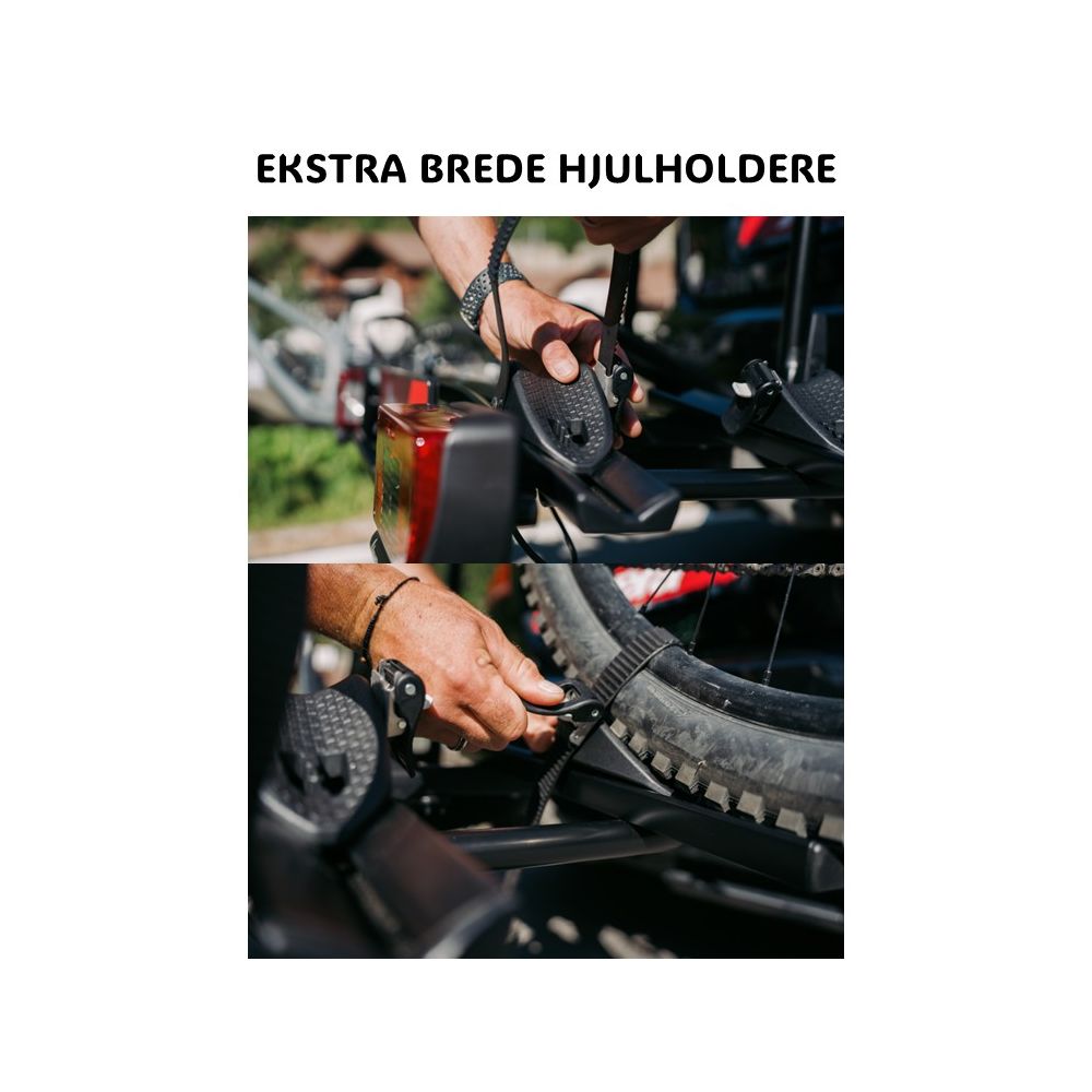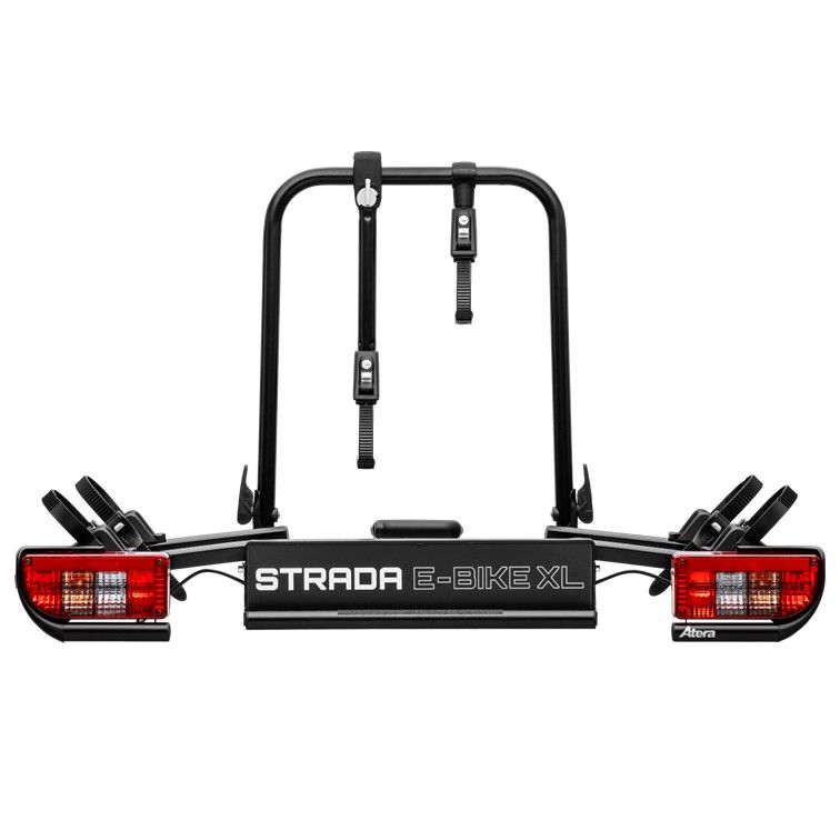 Atera Strada E-Bike XL Pro er en robust og brugervenlig cykelholder til anhængertræk, designet specielt til transport af tunge og lange elcykler. Den kombinerer høj bæreevne, lav vægt og smart funktionalitet, så du nemt og sikkert kan tage dine cykler med på tur. Cykelholderen leveres samlet og kan monteres på få sekunder. Den smarte quick-release kobling gør det nemt at montere holderen på bilens anhængertræk, og den fodbetjente tiltfunktion giver adgang til bagagerummet – selv når cyklerne er monteret.