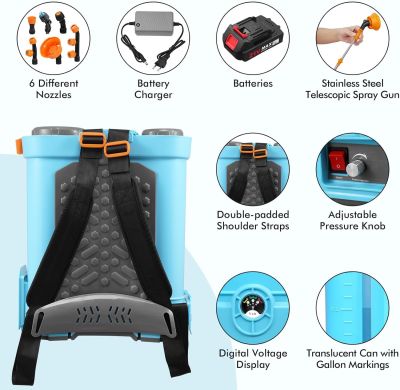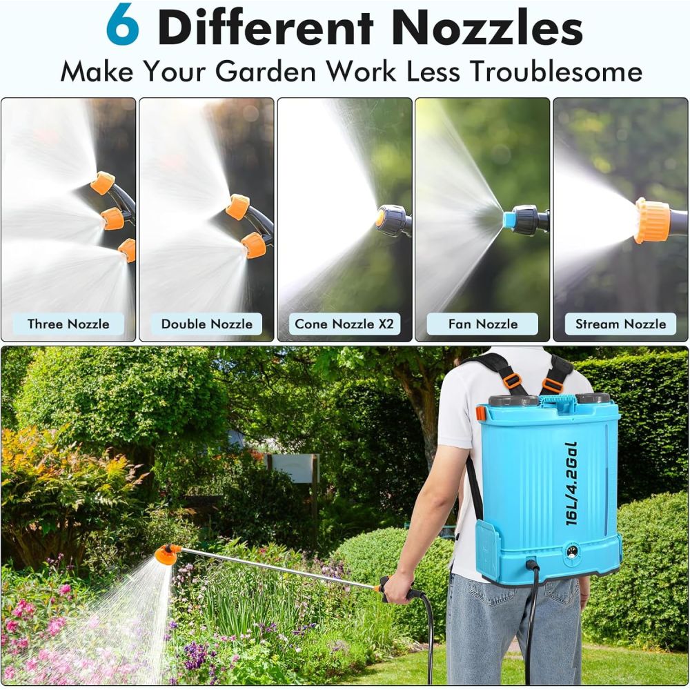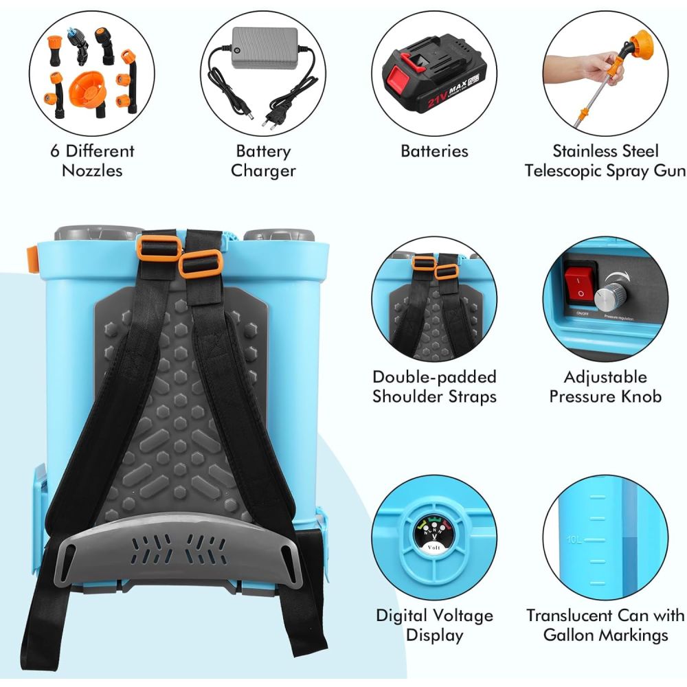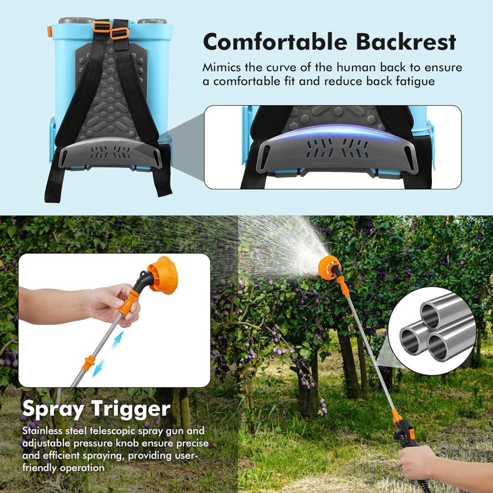 Den teleskopiske sprøjtestav i rustfrit stål, justerbart tryk og flere dyser sikrer præcis sprøjtning. Samtidig giver de polstrede skulderstropper, den gennemsigtige beholder med målemarkeringer og det vandafvisende design en komfortabel og brugervenlig oplevelse.