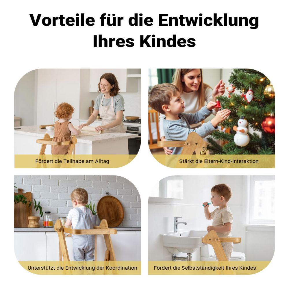 Børnestolen kombinerer sikkerhed, funktionalitet og et pladsbesparende design i ét gennemtænkt møbel. Fremstillet i robust bambus hjælper denne læringstårn dit barn med at lære, lege og deltage aktivt i hverdagen på en tryg måde. Uanset om den bruges i køkkenet, på badeværelset eller som læringsstol, understøtter den barnets selvstændighed, kreativitet og motoriske udvikling. Den højdejusterbare platform kan indstilles til 38 eller 46 cm, så stolen vokser med barnet og altid giver stabil og sikker støtte. Det gør det nemt for barnet at stå korrekt og komfortabelt, når det for eksempel hjælper til i køkkenet, vasker hænder eller børster tænder. Barnet kommer op i øjenhøjde og får lyst til selv at deltage i hverdagens gøremål.