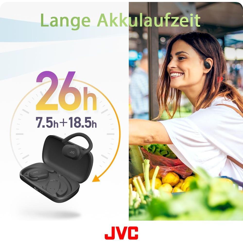 Bluetooth 5.4 sikrer en stabil og hurtig forbindelse med automatisk parring, og det indbyggede mikrofon- og stemmestyringssystem gør det let at holde hænderne fri. Den kraftige 16 mm neodymium-driver kombineret med JVC’s ekspertise i ”open-ear”-design giver et imponerende lydbillede med høj lydtryk og klarhed. Du kan endda tilpasse lyden efter din smag med tre lydtilstande – normal, high og bass – så du altid får den bedste oplevelse, uanset hvilken type indhold du lytter til.