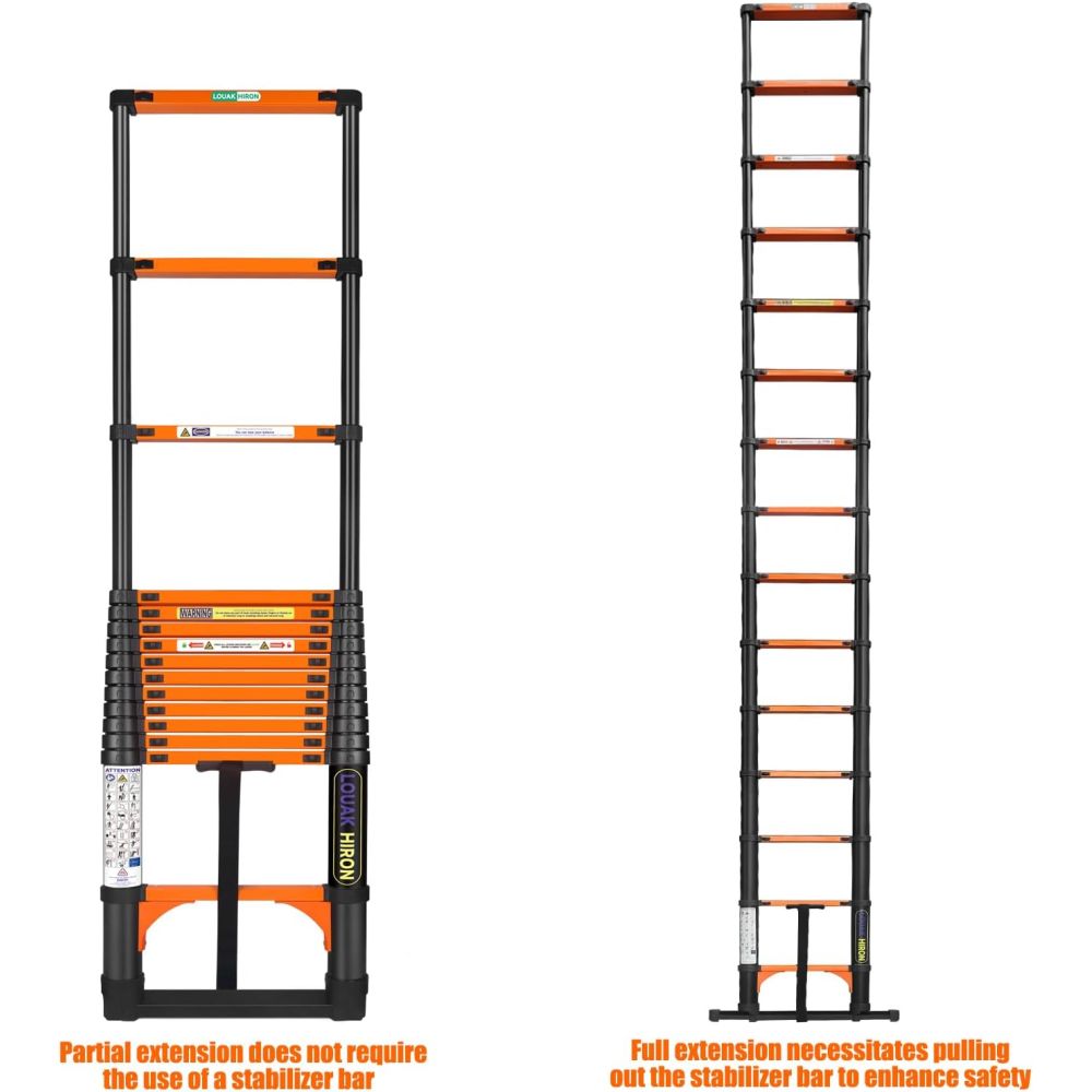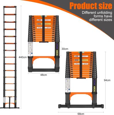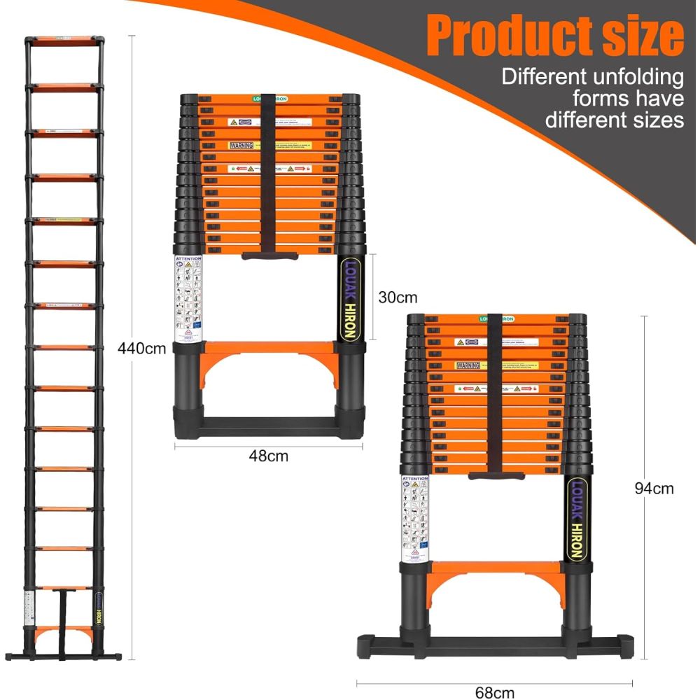 Teleskopstige er kun 0,91 m stor efter foldning. Den kan opbevares i kælderen, på loftet eller i depotrummet for at spare plads og lette transporten. Stigen har et foldedesign med en højde på 4,4 meter og i alt 14 trin.