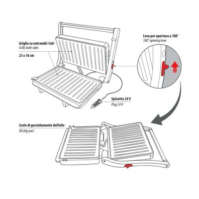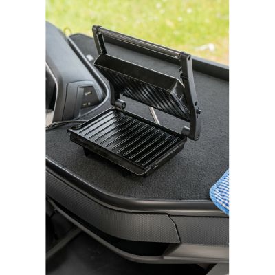 Når pladerne åbnes 180°, forvandles enheden til en praktisk grill eller stegeplade. Her kan du tilberede rødt kød, hamburgere, fjerkræ, pølser og fisk direkte i lastbilen. De forhøjede kanter på pladerne hjælper med at holde saft og fedt inde på grillfladen, så madlavningen bliver mere kontrolleret og rengøringen lettere. Begge plader er udstyret med slip-let-belægning, som forhindrer maden i at brænde fast og gør rengøringen hurtig og enkel – en klar fordel i en travl hverdag på vejen. Toastmaskinen tilsluttes via cigartænderstik og har en kabellængde på 100 cm, hvilket giver fleksibel placering i kabinen. En praktisk og pladsbesparende løsning, der giver dig friheden til at lave varme, hjemmelavede måltider direkte i lastbilen – nemt, hurtigt og bekvemt.