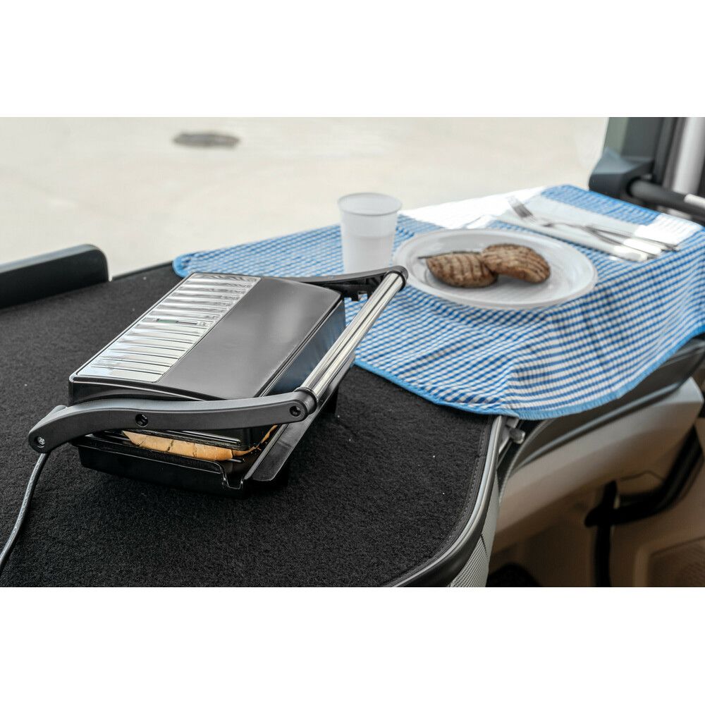 Denne kompakte og lette toastmaskine/grill er den ideelle løsning til dig, der kører lastbil og ønsker et varmt måltid på farten. Den smarte 2-i-1 funktion kombinerer sandwichmaskine og grill i én og samme enhed, så du nemt kan variere dine måltider – uanset om du holder pause på rastepladsen eller overnatter i førerhuset. Som sandwichmaskine er den perfekt til toast, panini, fladbrød og klassiske sandwiches. Den opvarmede topplade tilpasser sig automatisk tykkelsen på brødet og fyldet, hvilket sikrer jævn tilberedning og et ensartet, sprødt resultat hver gang. Det gør det nemt at lave både en hurtig snack og et mere mættende måltid.
