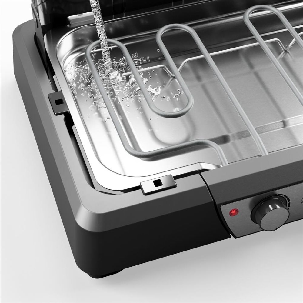 Grillen er designet til fleksibilitet. Den aftagelige vindskærm gør det let at skifte mellem bordgrill og traditionel grilloplevelse. Vindskærmen sikrer en stabil varme, selv på blæsende dage ved stranden eller på campingturen. Med en kraftfuld effekt på 2000 watt er grillen klar til brug på få minutter, så du hurtigt kan servere lækre, grillede retter. Den integrerede fedtbakke fyldes med vand før brug og reducerer røg markant. Fedt og saft drypper ned i vandbadet og afkøles med det samme, hvilket minimerer usunde røgpartikler og giver en renere og mere behagelig grilloplevelse – både for dig og dine omgivelser.