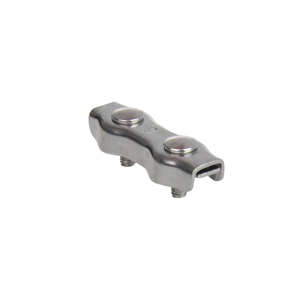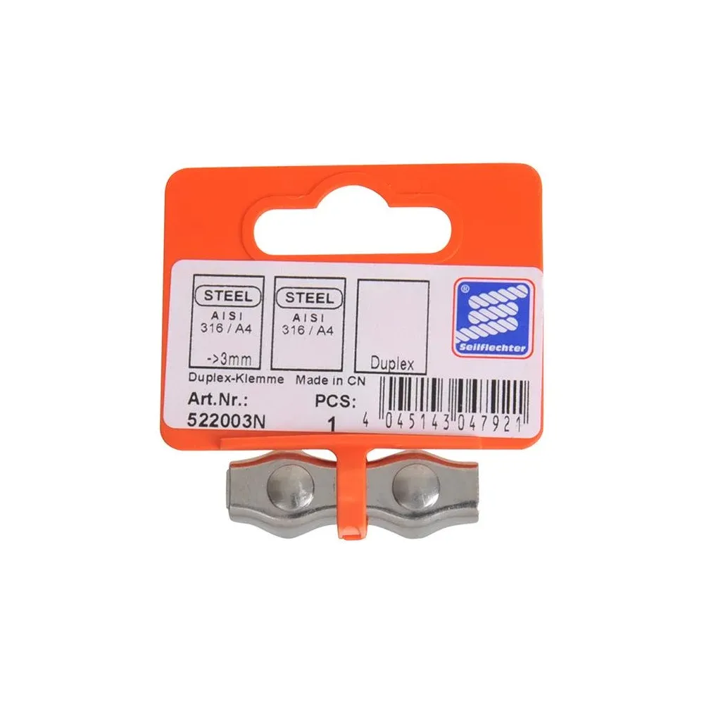 Robust og holdbar duplex wireklemme i rustfrit stål, som sikrer en stærk og pålidelig fastgørelse af stålwire. Klemmen er universel og kan bruges til både hobbyprojekter og professionelt arbejde – fx i både, sejlads, haveprojekter eller byggeri.