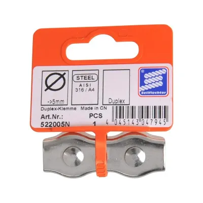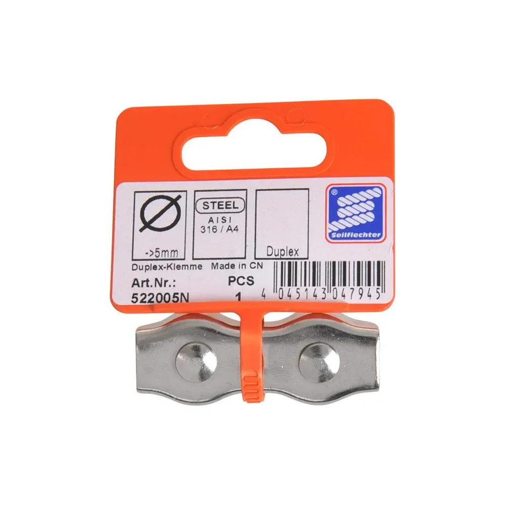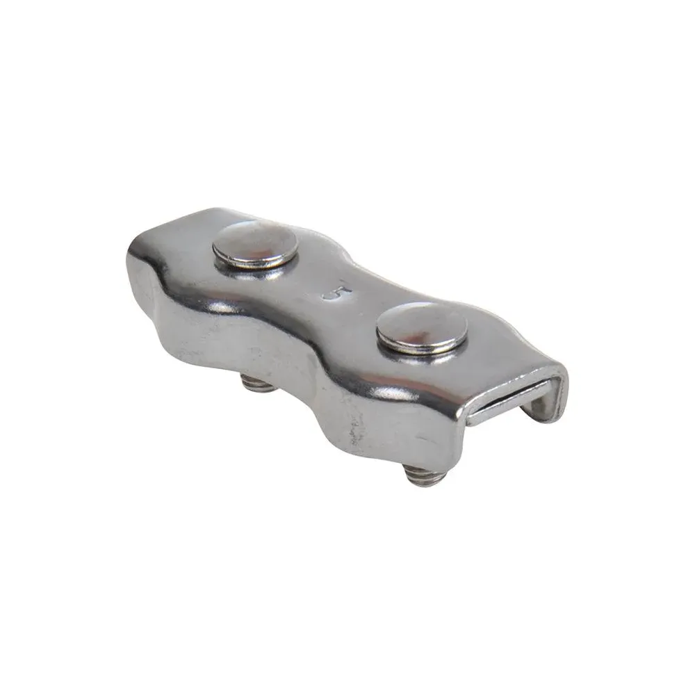 Robust og holdbar duplex wireklemme i rustfrit stål, som sikrer en stærk og pålidelig fastgørelse af stålwire. Klemmen er universel og kan bruges til både hobbyprojekter og professionelt arbejde – fx i både, sejlads, haveprojekter eller byggeri.