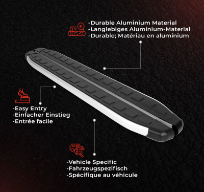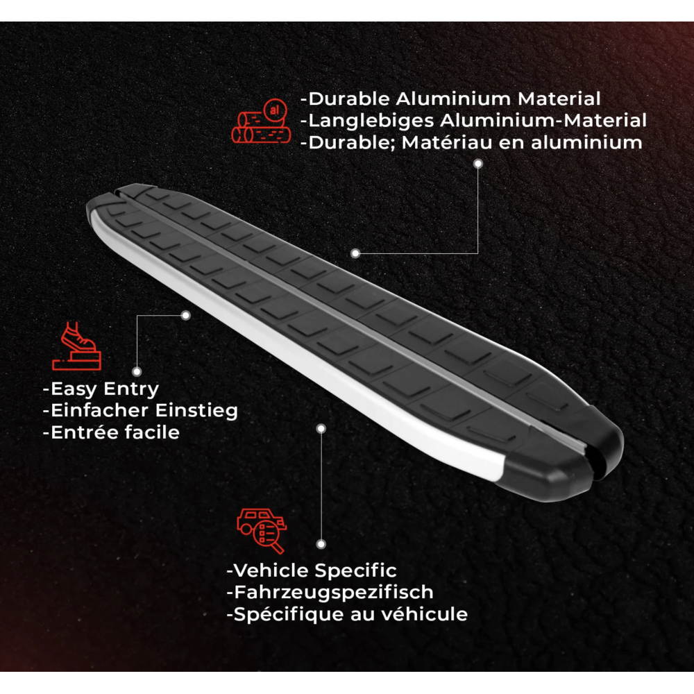 Dette sæt trinbræt i aluminium gør det betydeligt mere komfortabelt og sikkert at stige ind og ud af din bil, især ved hyppig læsning eller for familier med børn. Den skridsikre overflader sikrer et fast greb i alt slags vejr. Enhver, der regelmæssigt kører sin bil, kender til problemet, at det kan være en reel udfordring for mange at klatre op, uanset om man har skader, ældre mennesker eller børn. Især i dårligt vejr eller når køretøjet er fuldt læsset, bliver hvert skridt en test af usikkerhed. Dette sæt trinbræt i aluminium tilbyder stabil og skridsikker løsning, der forenkler hverdagen og sikrer større sikkerhed.
