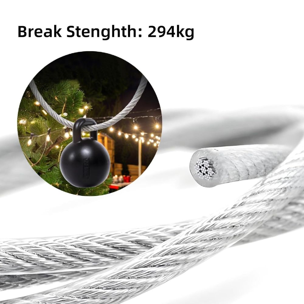 Denne alsidige og holdbare stålwire er fremstillet af 304 rustfrit stål med en 7x7 flettet struktur, hvilket giver høj styrke og fleksibilitet. Wiren er PVC-belagt, hvilket gør den vandafvisende, isoleret og modstandsdygtig over for korrosion – ideel til både indendørs og udendørs brug. Perfekt til havearbejde, terrassedekoration, ophæng, gør-det-selv-projekter og meget mere. Leveres med 10 aluminiums-klemmer, så du nemt kan fastgøre eller samle wiren efter behov.