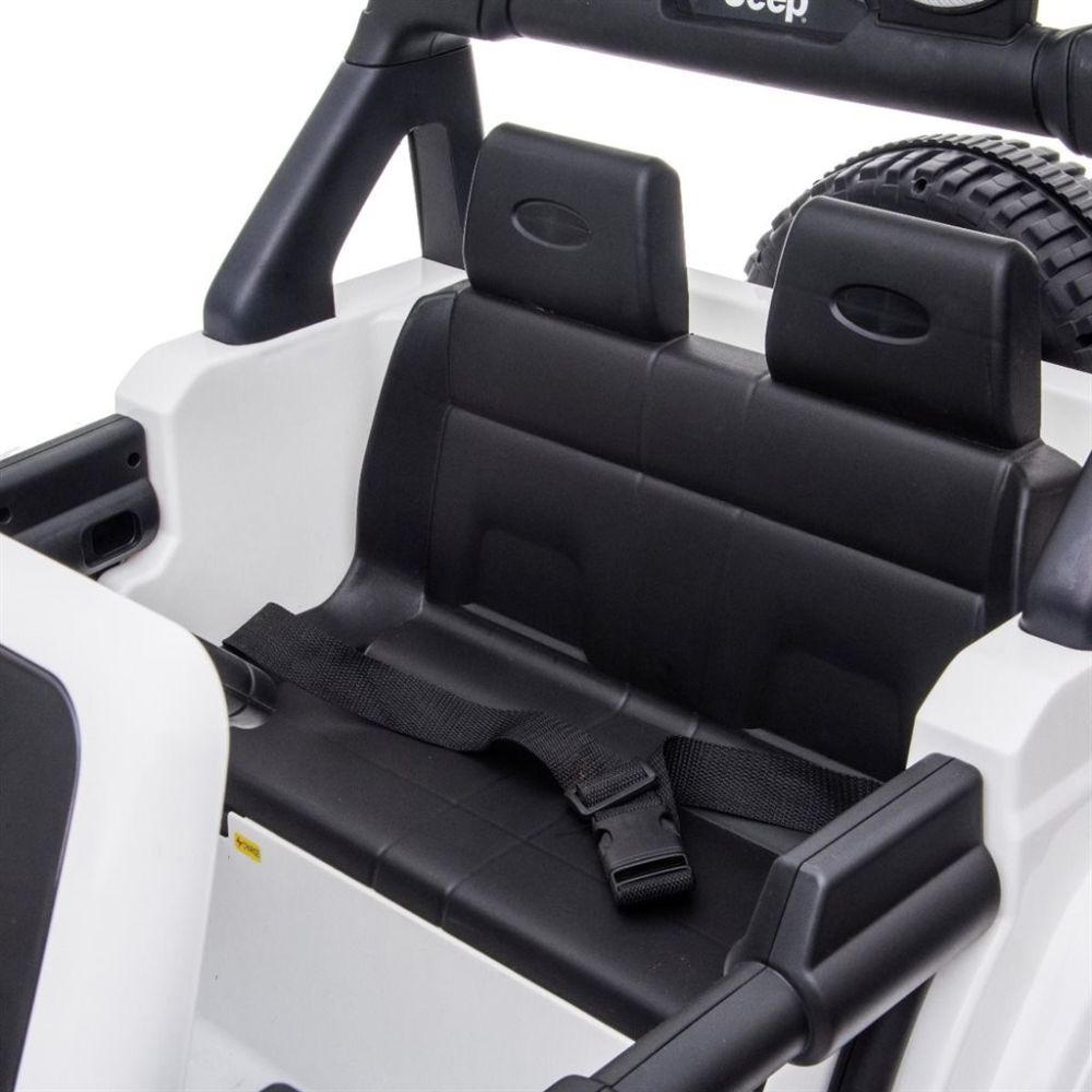 Med fire kraftige motorer og 4-hjulstræk får barnet en stærk og stabil køreoplevelse, uanset om det er på græs, grus eller fliser. De affjedrede hjul og solide EVA-dæk sikrer komfort, mens det flotte design giver følelsen af en ægte Jeep.
